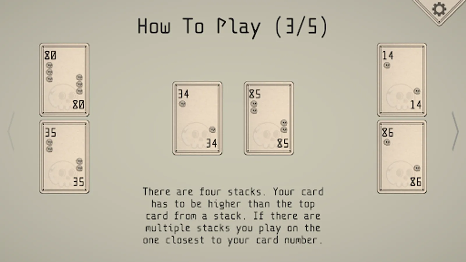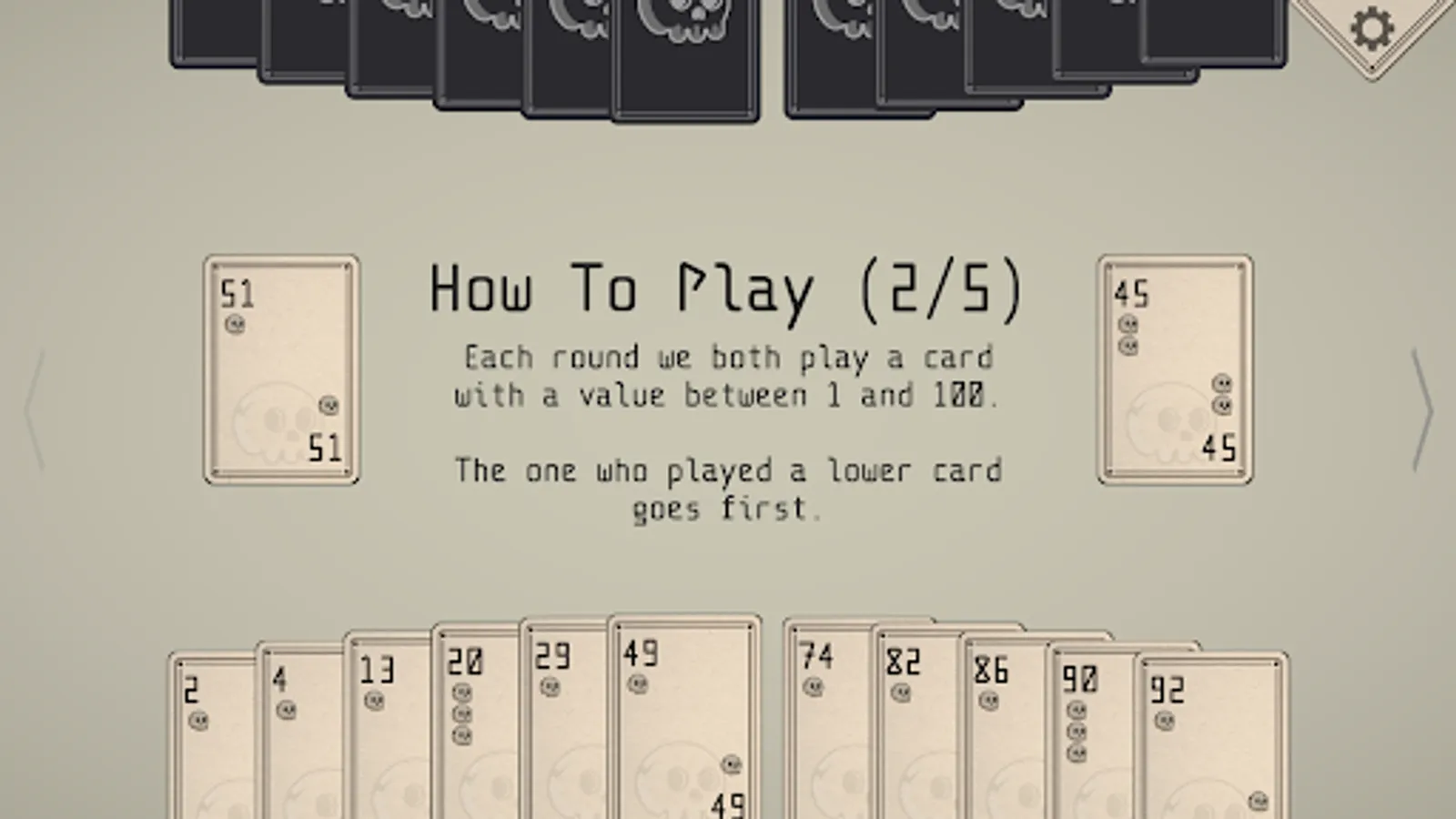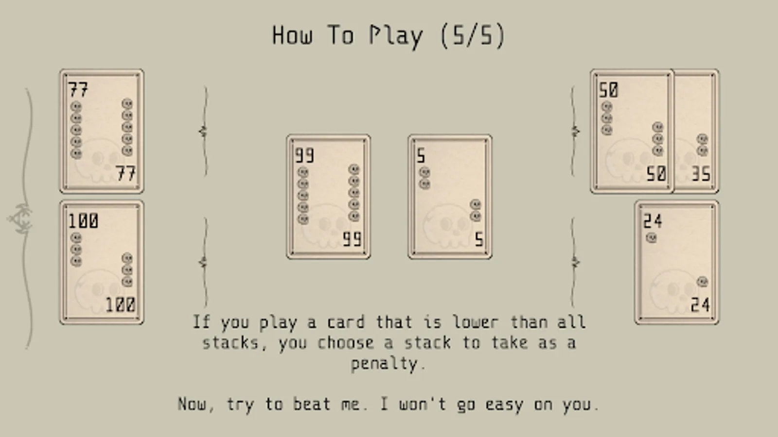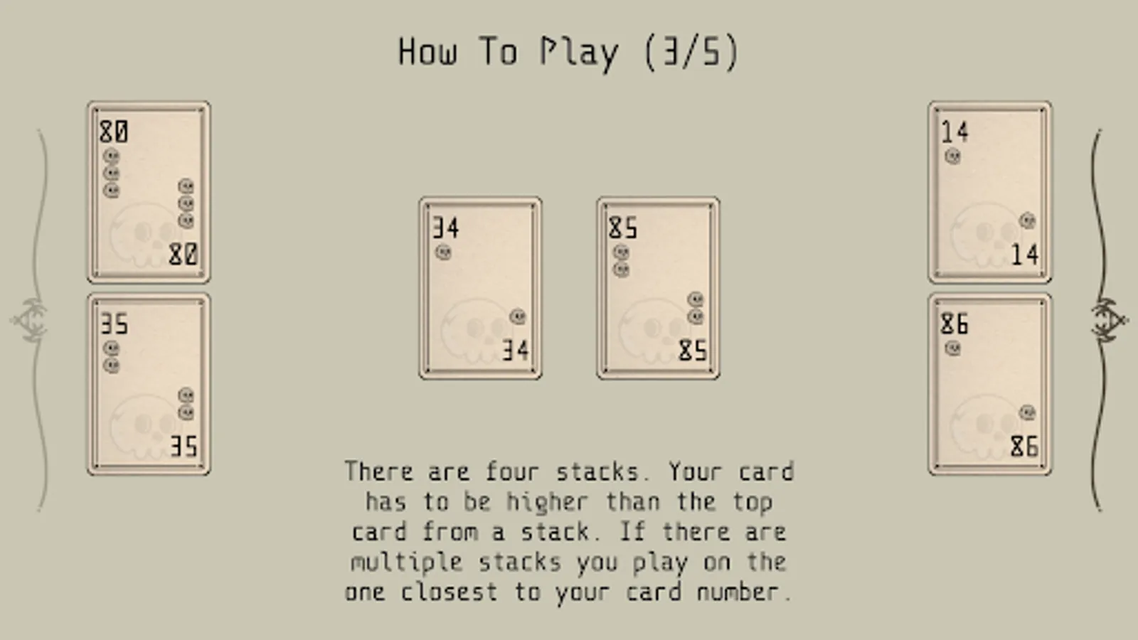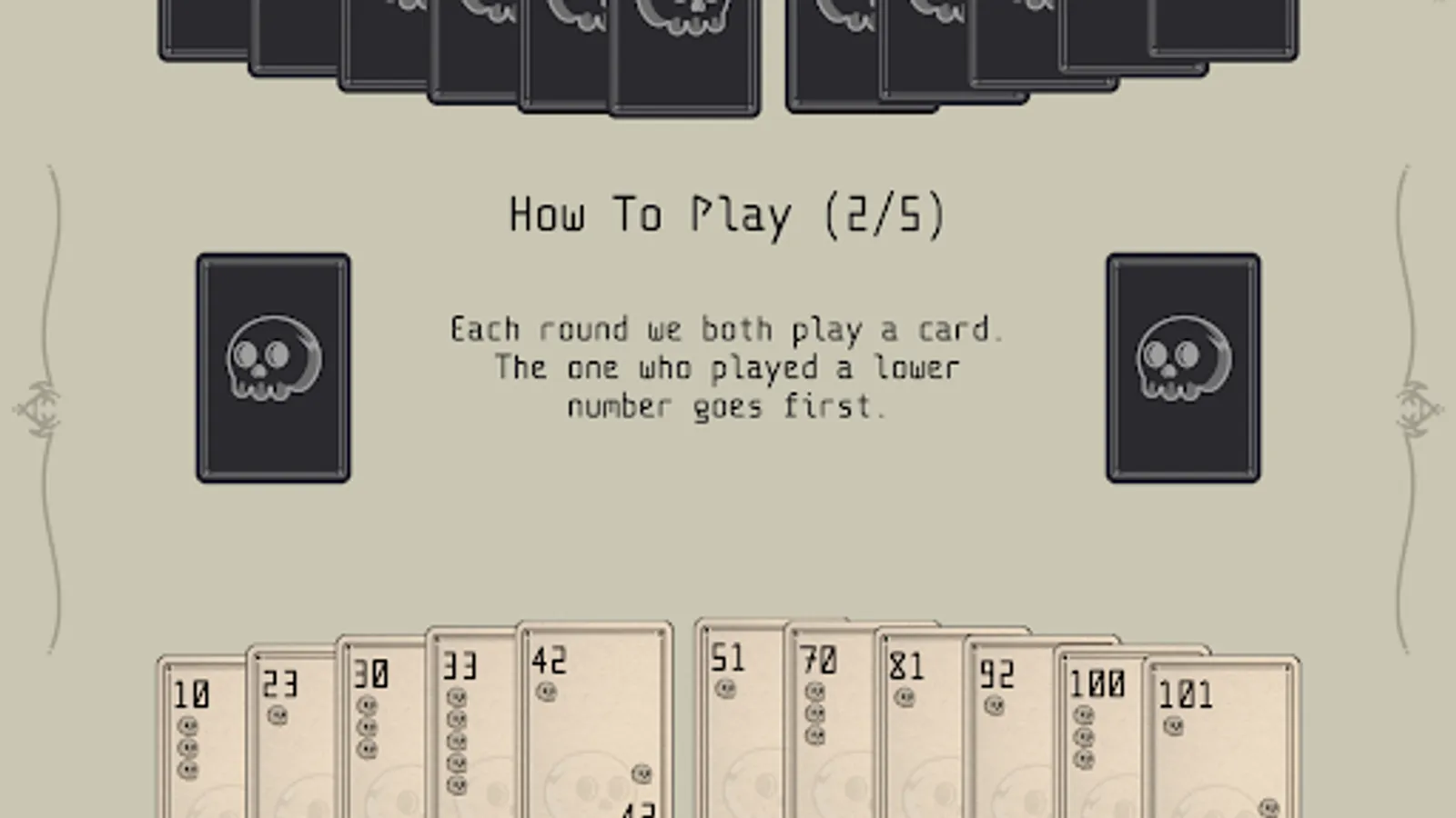 You want more details first? Fine. We each start with 12 cards. In each round, we both play a card on different stacks collecting penalty points. Whoever has the least amount of penalty points at the end wins. You can play multiple rounds and keep track of your overall score.