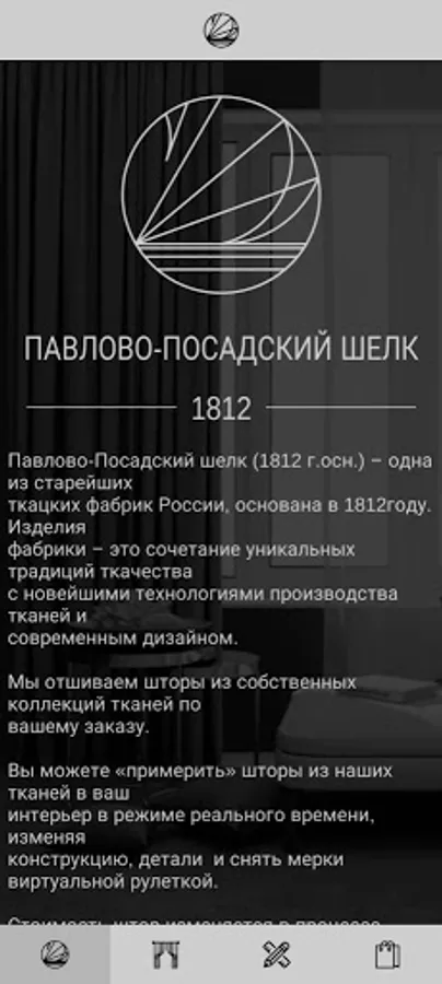Pavlovo Posad silk (1812 osn.) - one of the oldest weaving factories in Russia, founded in 1812. The products of the factory are a combination of unique weaving traditions with the latest technologies of fabric production and modern design. We sew curtains from our own fabric collections according to your order. You can “try on” the curtains from our fabrics in your interior in real time, changing the design, details and taking measurements with a virtual tape measure. The cost of curtains changes during the design process in our application.