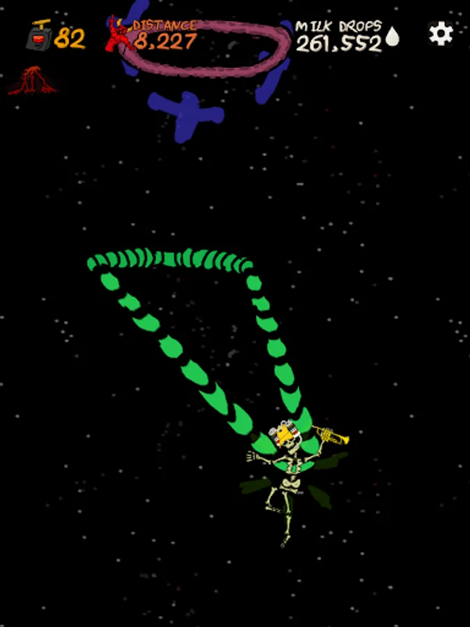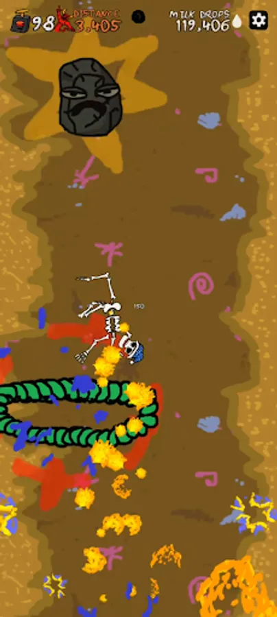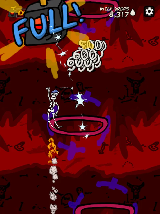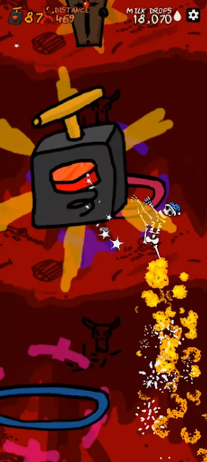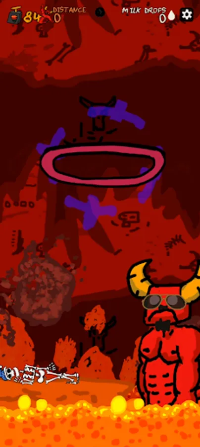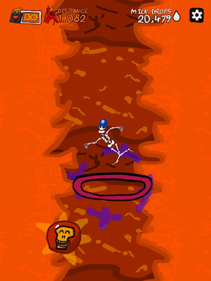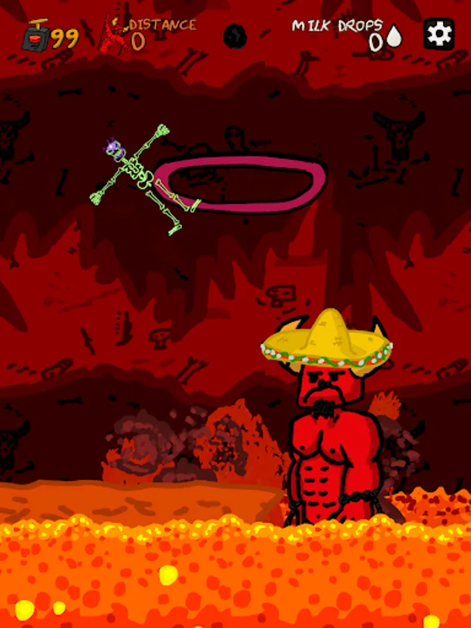 While trying to get a glass of milk, Skelly is dropped into what appears to be hell. With no muscles to speak of, it's up to you to help them. Find a friendly red person, rubber bands, explosive junk, teeth, hearts and more explosions to help get your fridge back. What adventures await you on your mission?