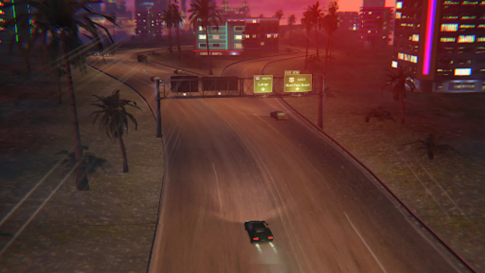 Welcome to FLORIDA INTERSTATE '86, a light-weight driving game where the goal is to cruise into the sunset for as long as possible while earning points by collecting cassette tapes and driving dangerously. A dynamic noon-sunset lighting system, a selection of colorful retro-styled sports cars and a synthwave/chillwave soundtrack ensure that every single one of your trips into this '80s fantasy Sunshine State is a unique one.