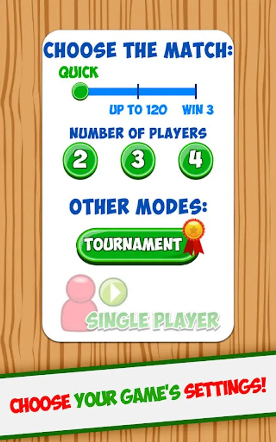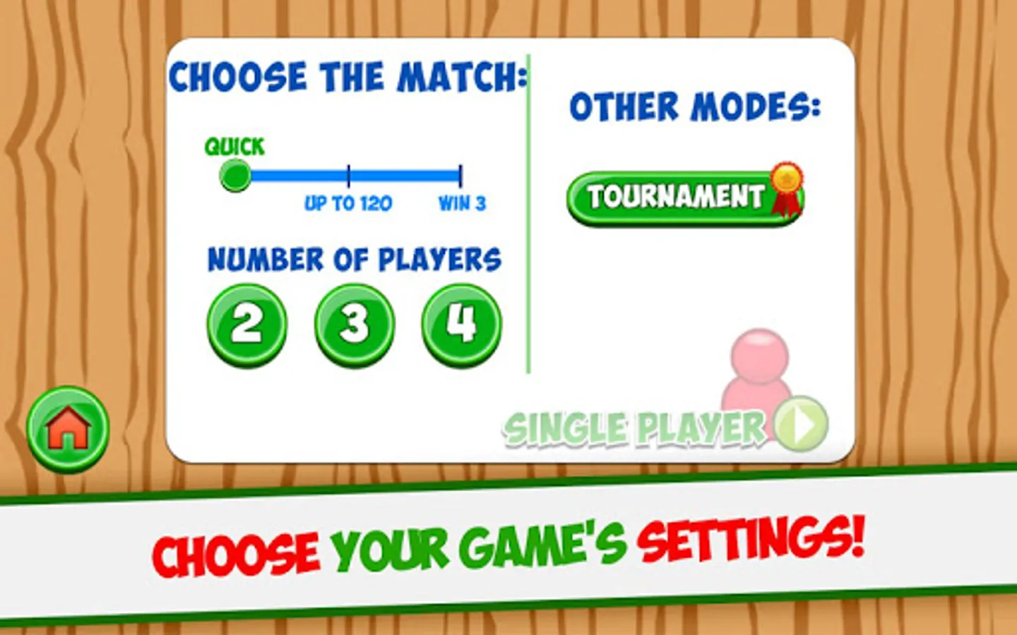 - SINGLE PLAYER matches, where you will be able to decide the type of match (quick, up to 120 points, win 3/5)
