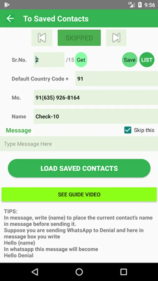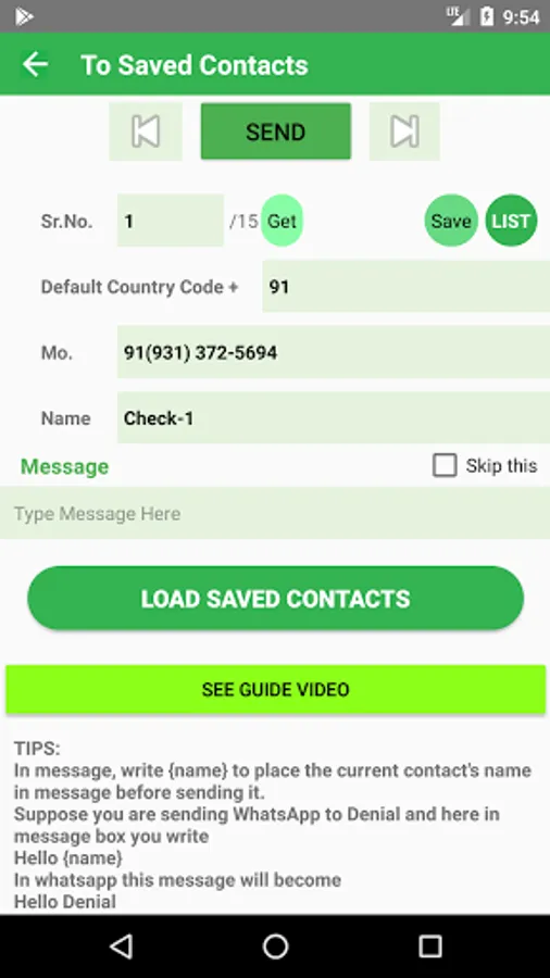 Send Dynamic WhatApp™ messages to Saved contact. Ex. If User wants to send a message with the name of that person then in the message he/she needs to write {name}. This “{name}” will be replaced by the name of the saved contact in each massage.