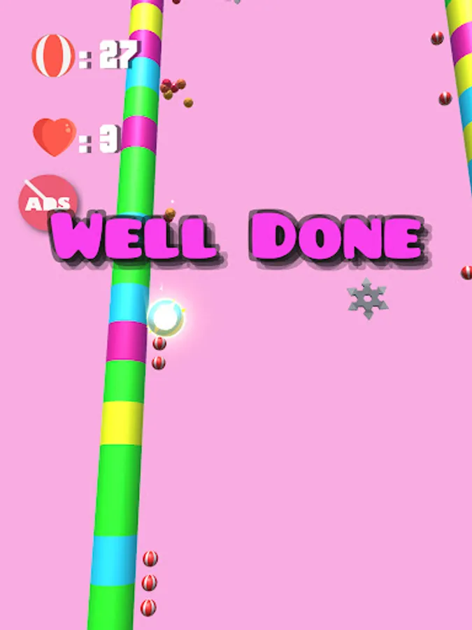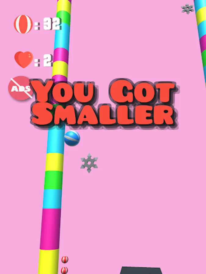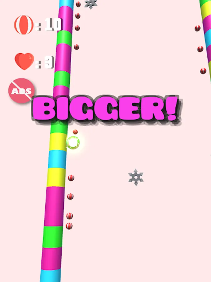 Jump between two rollers and collect small balls to grow and reach the top! In the meantime, try not to get caught by the ninja stars. Just tap the screen to jump and tap again to hold on. Remember, you can only hold on to sections of the same color as the ball.