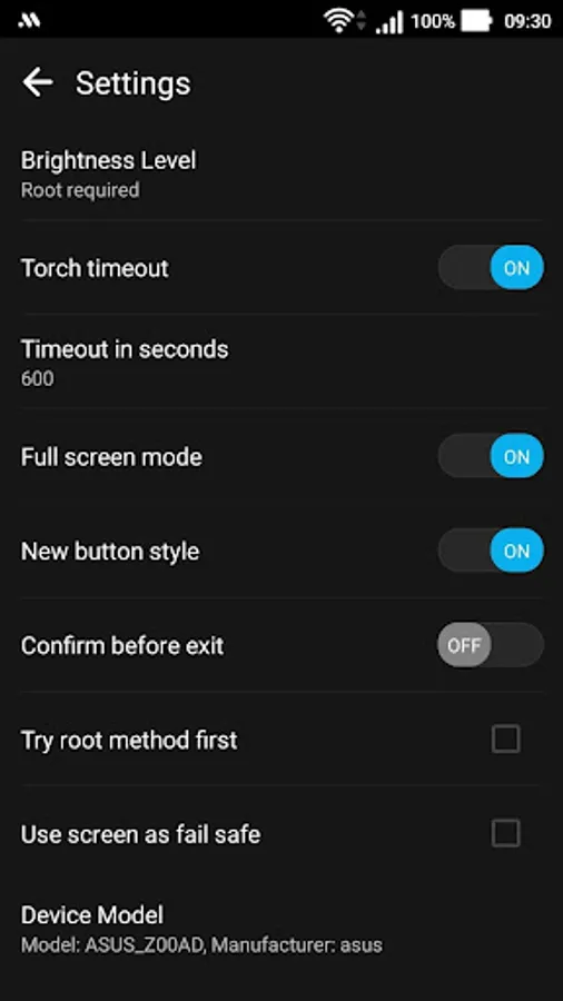 The widget icon will show the status of the torch. If you want to change the settings please do so from inside the application settings.