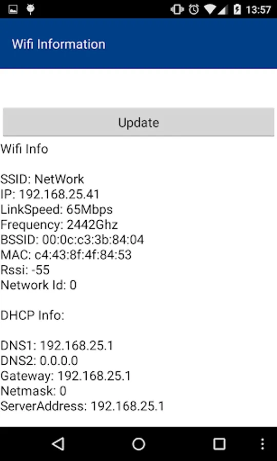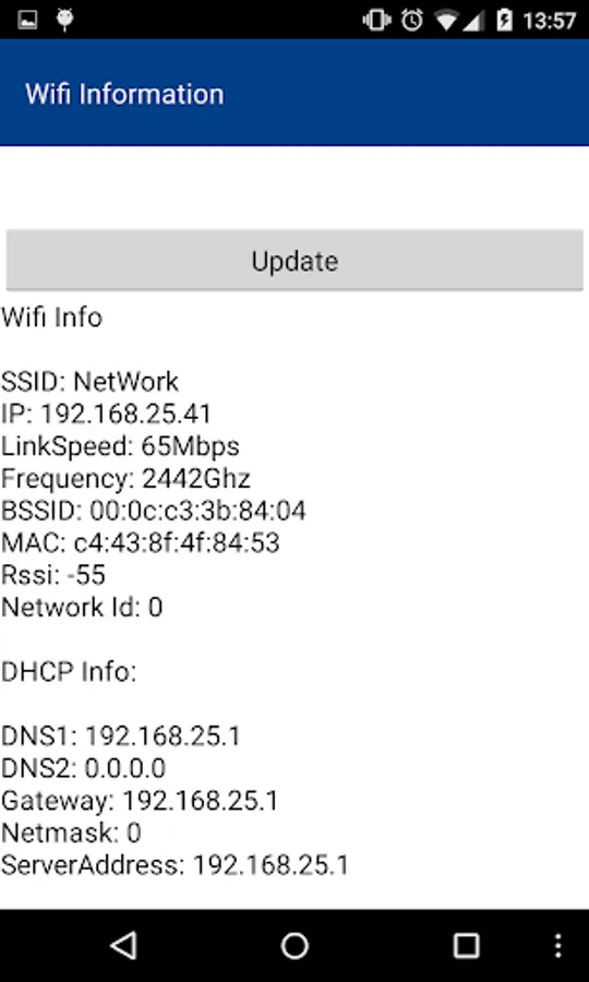 Use The Wifi Information for Have Access to the Information About your Wifi Connection: BSSID , Frequency , SSID , Speed , Mac , RSSI , Network Id, DNS and more .