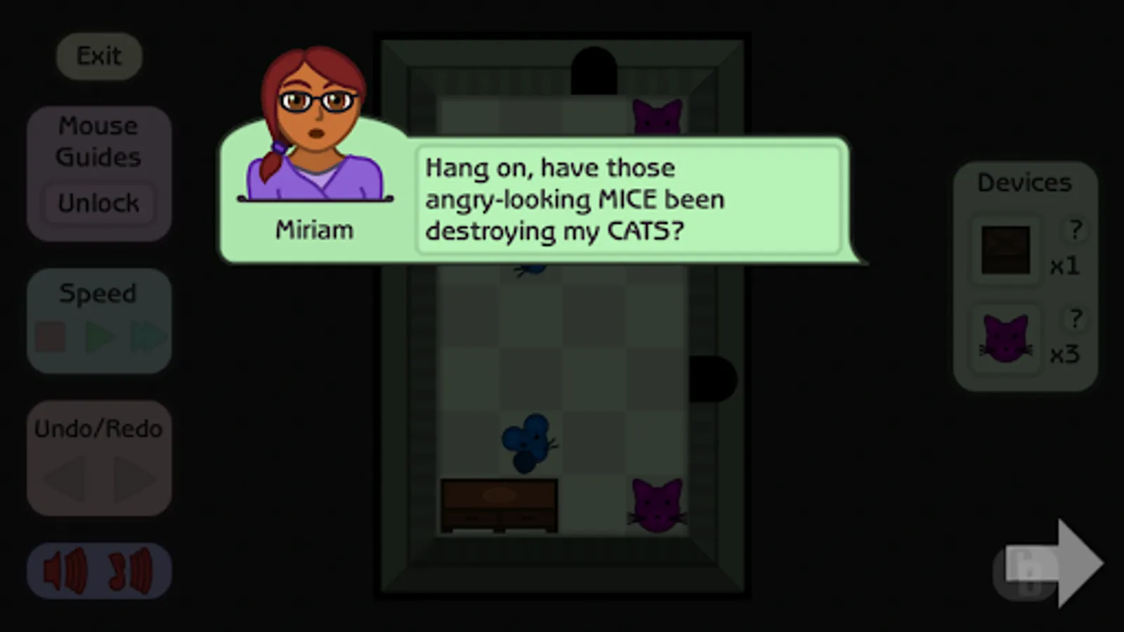 Using a selection of simple devices Miriam has created, guide and lure the mice into their holes, clearing all of Miriam's puzzling rooms. But as the mice try to strengthen themselves, and Miriam develops further devices to counter them, be careful not to be caught in the middle of an arms race!
