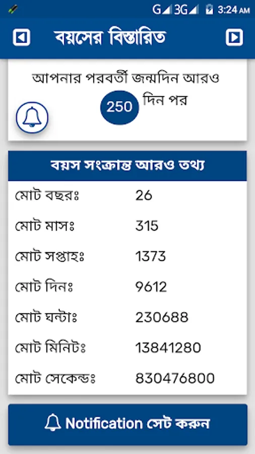 This app can calculate the your actual age by calculating the difference between today and your birthday (jonmo tarik). Even if one's birthday is Leap year or year , it can make accurate calculations. Also, how old you are on any given day - it can accurately calculate the number of hours and minutes of the month to the day of the year.