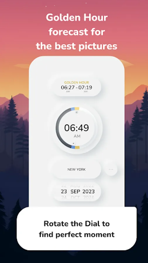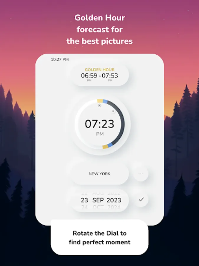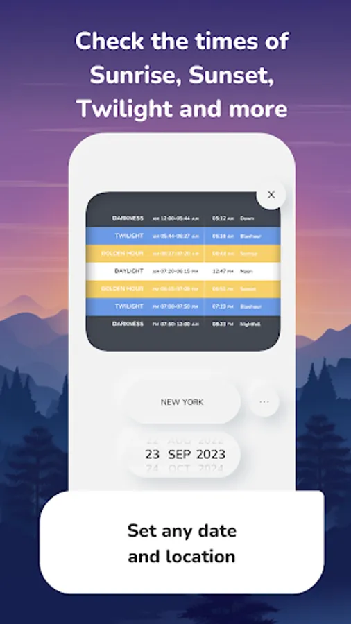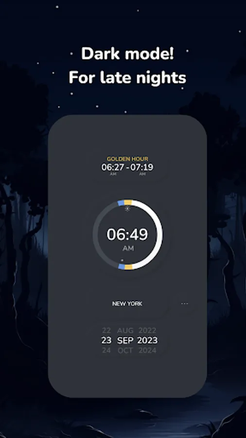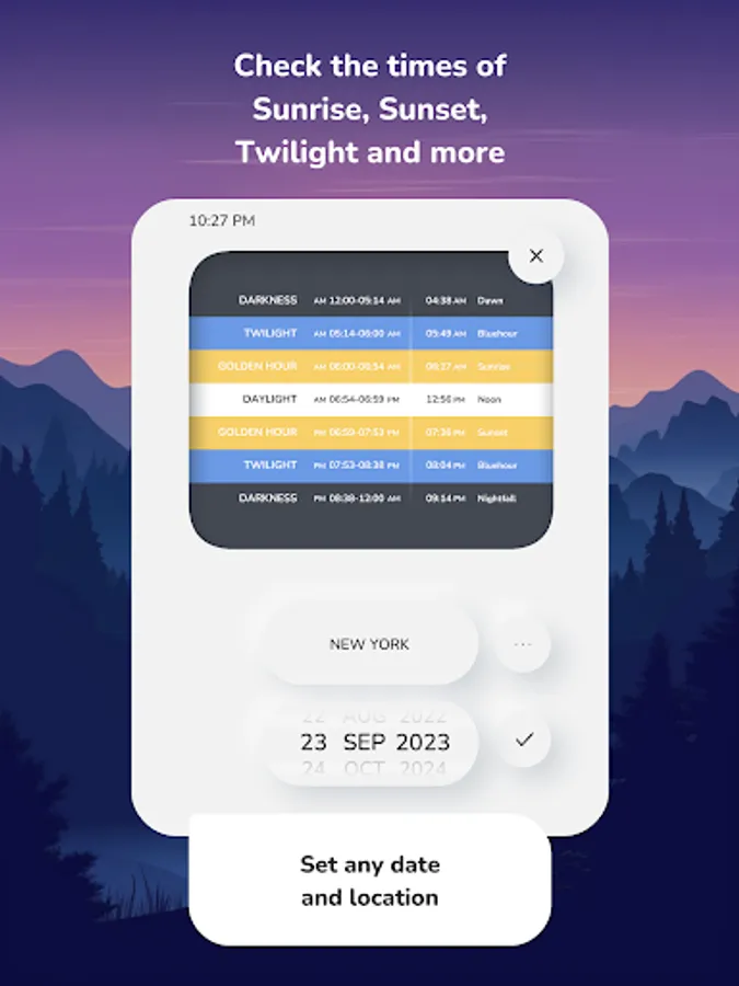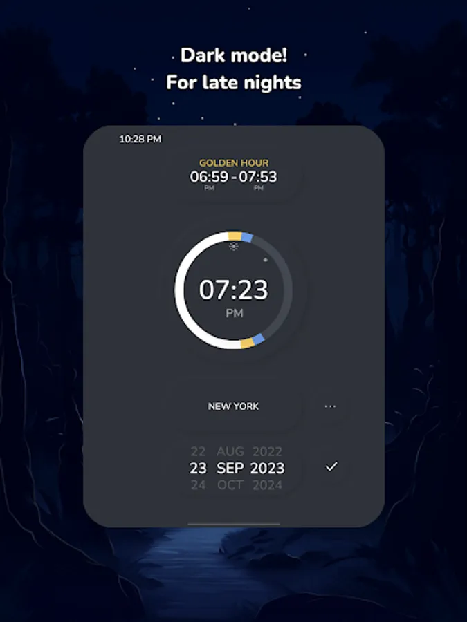 Golden Hour & Beyond: Track precise timings for Golden Hour, Sun rise, Sunset, Twilight, Blue Hour, Daylight, Noon, and Moon light times.