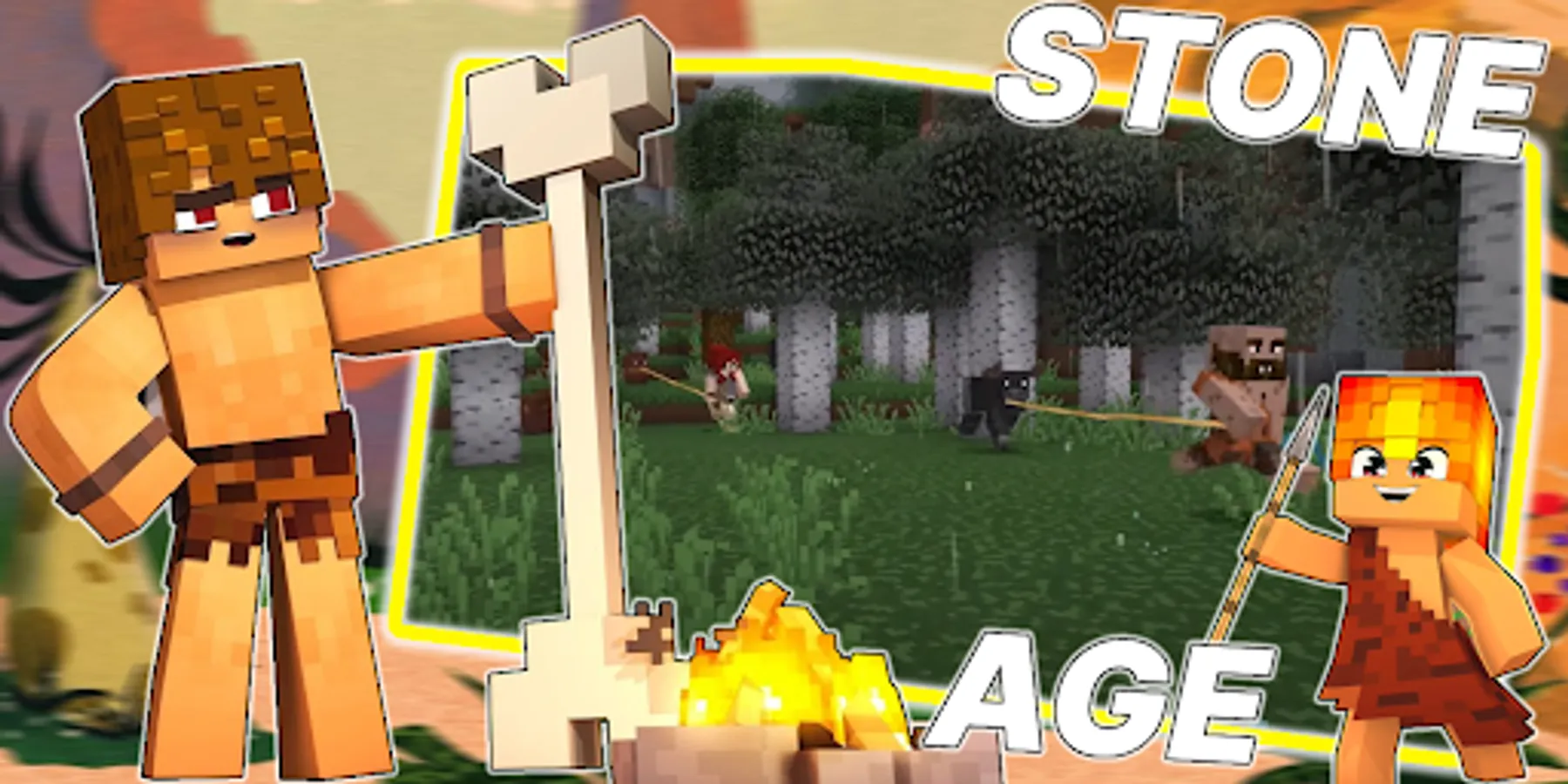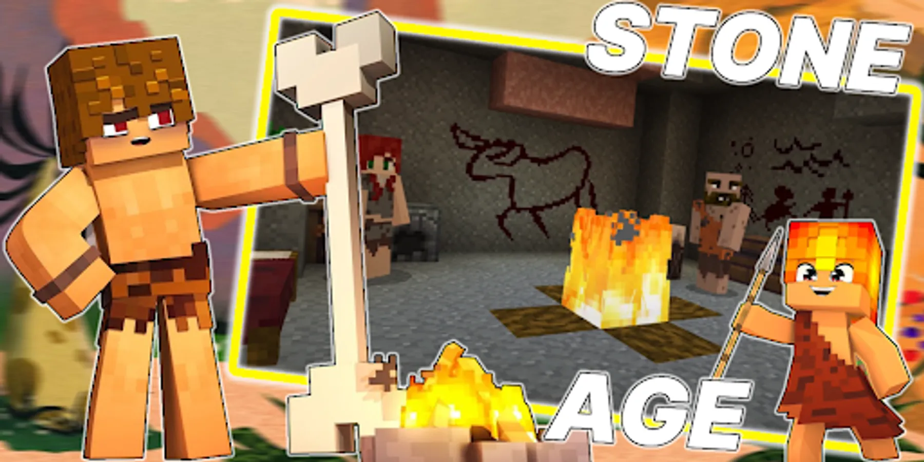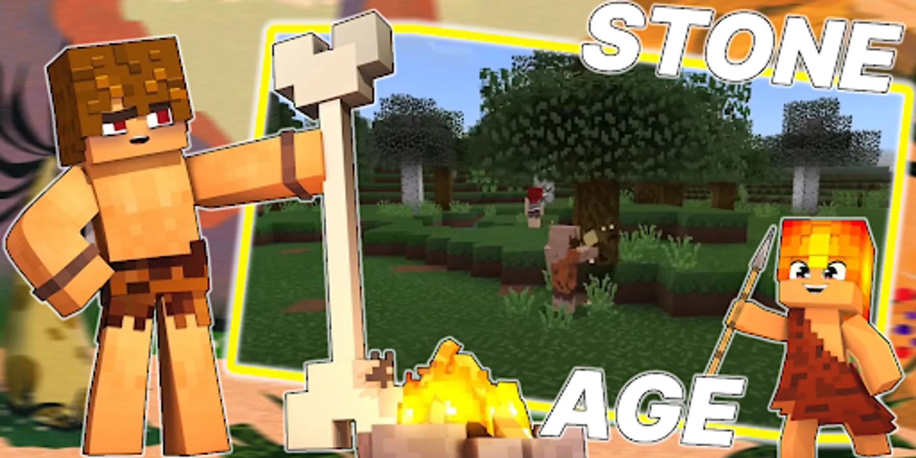 The stone age mod will move you in time, you will find yourself where there is no electricity and computers yet, dynamite has not yet been invented and dinosaurs are still alive. Traveling through biomes will become even more fun, you can meet ancient NPCs, build tents, sleep on beds of hay, dig new ore, tame and ride mammoths, craft a new type of spear weapon and become the leader of your tribe. Dangers will lie in wait for you at every turn, some creatures will wait for you in aquatic biomes (lakes, seas and oceans), others, such as pterodactyls, will mercilessly attack you in the sky, but even if you just go out into a desolate place. Defend the villagers from ancient dinosaurs. But dinosaurs are not the only threat. The mod will change creepers, endermen, skeletons, golems and other mobs to raptors, tyrannosaurs rex, pterodactyls, mammoths and other animals of the Stone Age. Once you defeat the dinosaur, you can cook its meat over a fire and replenish your hunger. Survival in such a world, although difficult but exciting, the game will become more interesting and exciting. The pixel world will become more adapted for survival and stone tools will help you with this, just craft them and go on the extraction of resources and new adventures. The ancient world will allow you to meet new animals: saber-toothed tiger, rhinos, deer and mammoths. You will get useful skills - lighting a fire and taming animals. New items: venison, fat, antlers, flour, mammoth tusk, backpack, grass and webbing net for fishing and much more. New blocks: aqueduct, feeders, tree stump, stone chest. You can try all this in creative mode and then go to survival mode and craft everything.