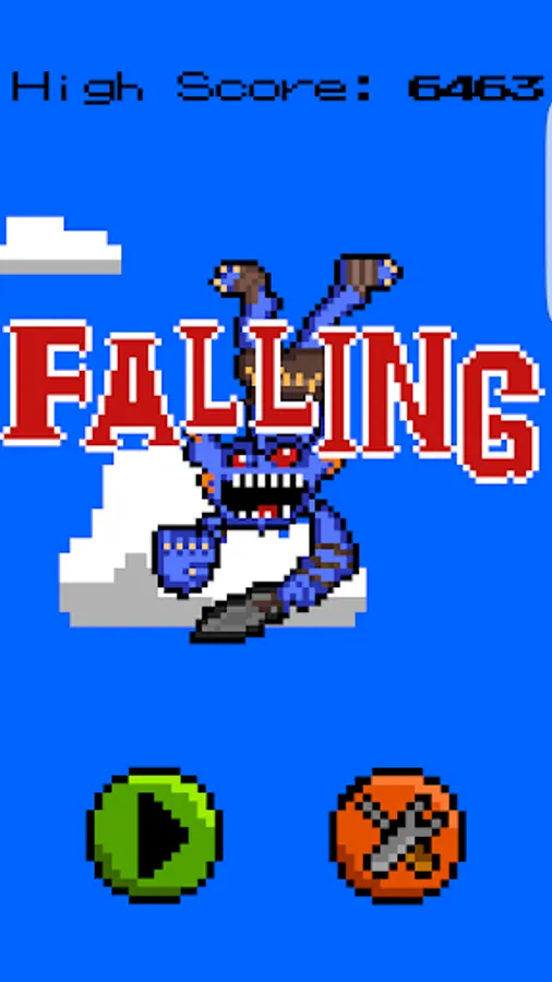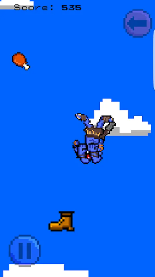 Oh no! Loads of Goblins have all started falling from the sky (for some obscure reason) and it's your job to try to delay the inevitable. Grab some SKIP's to make your Goblin invvincible and avoid HIT's that make your Goblin fall faster But don't forget! Goblins are hungry and LOVE chicken so pick some of those up while you're pummeling to your doom. Boots are a no go though, as they only hit your Goblin and make him dizzy. Happy Falling!