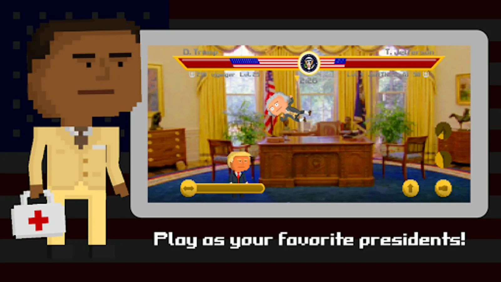 Presidential Smackdown is an online competitive fighter where players battle to determine who is the best president! Defeat your opponents to acquire medals, diamonds, and supporters to climb leaderboards and unlock new presidents, cosmetics and more! Every president features different abilities to ensure unique gameplay, packed action, and competitive battles!