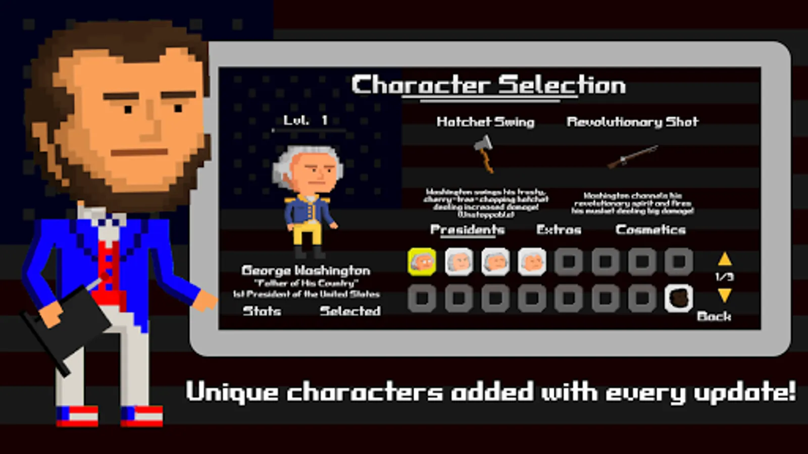 Each president can be unlocked using medals or diamonds acquired by winning battles. The abilities of each president reflect events and actions of their time in office. Every president has a different skill set and abilities so make sure to try them all!