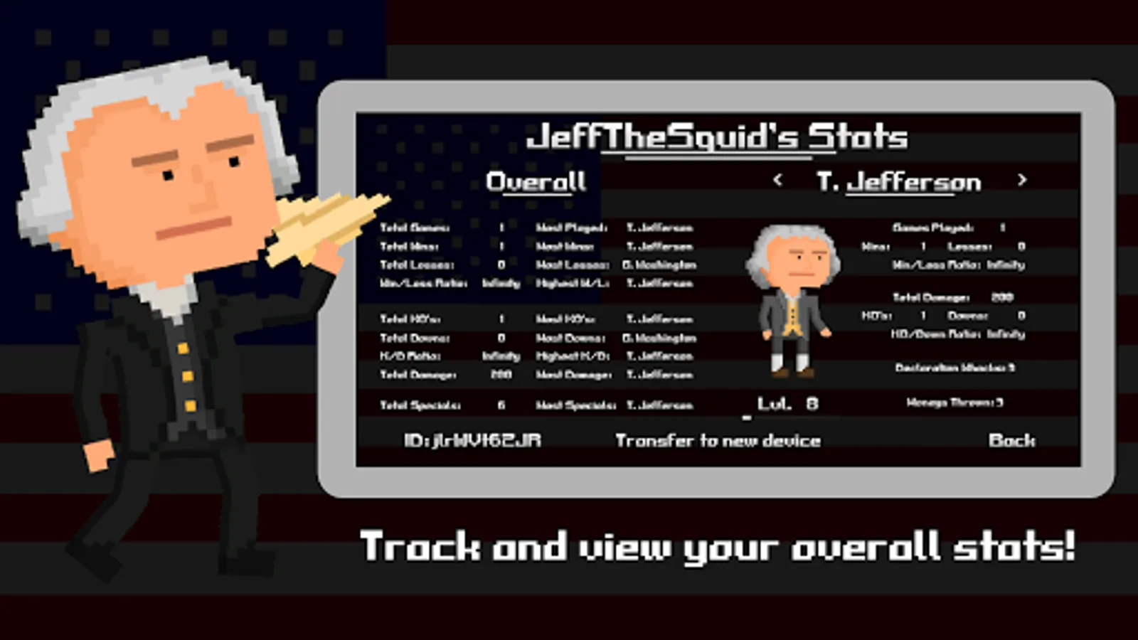 Presidential Smackdown will keep track of each and every smack landed and elbow dropped and display your stats on a smooth interface. You can set friendly competitions with your friends to prove who can have the best win/lose ratio or fire the most muskets! Your stats are online, so you can transfer them to any device!
