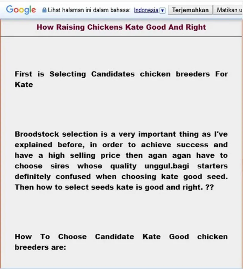 In addition to laying and broilers, ornamental chickens also have a relatively high economic value. several types of ornamental chickens that are widely cultivated include kate chicken, bangkok chicken and partridge. Chicken is one type of ornamental chicken that is in great demand by various groups of society. This type of chicken has its own uniqueness compared to other types of chicken, so it is very easy to distinguish. Chicken kate is instinctively the same as a dove, which lives in pairs - pairs. Throughout its life kate chicken will continue to pair with these partners. However, the possibility of interbreeding in kate chickens can also occur, namely by placing one male among several females. Good selection of broodstock is an important capital. If you choose the broodstock wrong, the result is that the chicken kate livestock process will be hampered and can even cause kate chicken farming to fail. To avoid failure you can learn how the kate chicken I have prepared in the Kate Kate Cattle Complete application, thank you good luck .