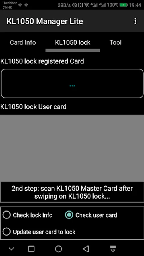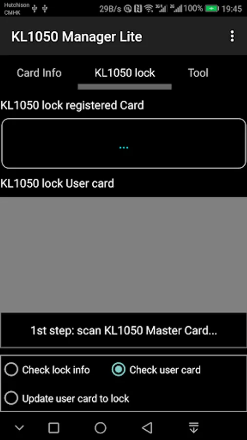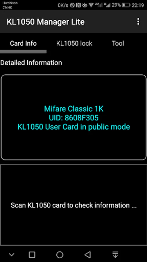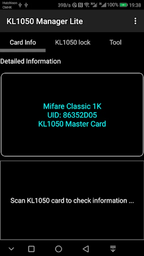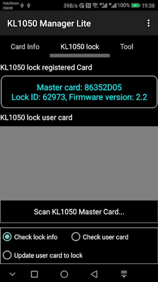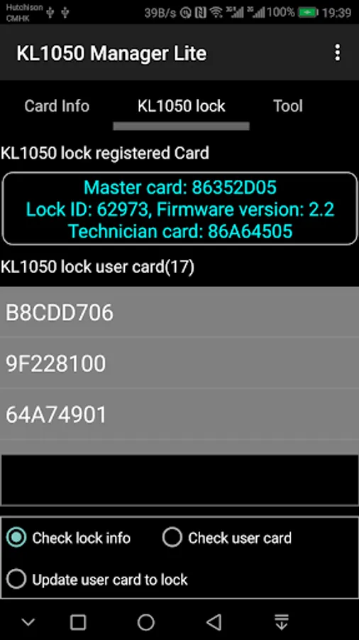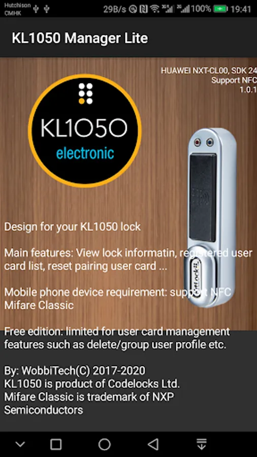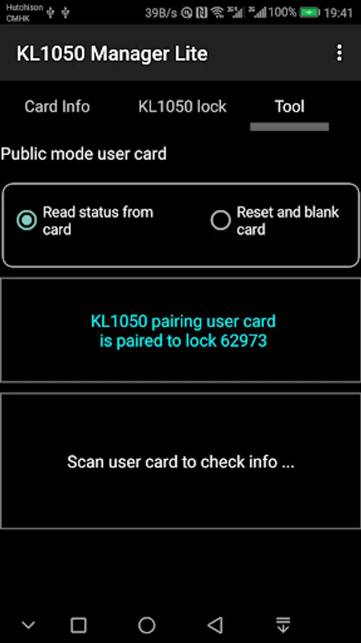 Main features: can view the lock information, such as registered Master Card, Technician Card and user card list, the tool to reset pairing user card, scan and read the KL1050 compatible card information...