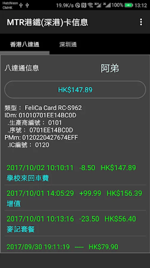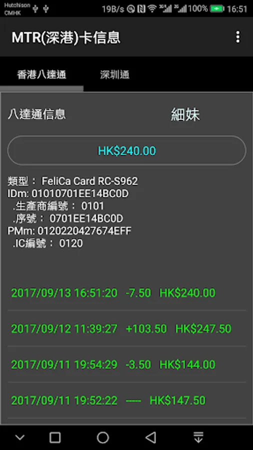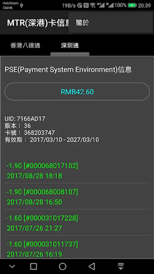 1. Check balance and last ten transaction of MTR ShenZhenTong