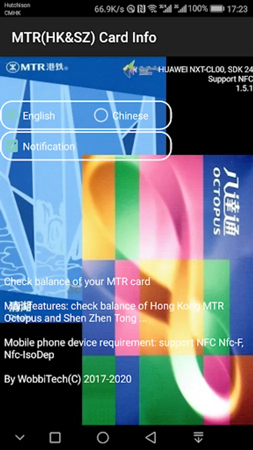 Main features: check banlance of Hong Kong MTR Octopus and Shen Zhen Tong, display more information of Nfc-F tag ...