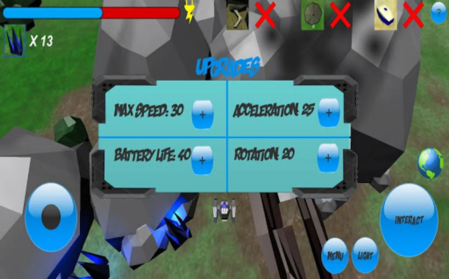 Wezz has crash landed on an alien planet, you must control him to find the three lost parts of his ship so he can escape and fly back into space, during your journey you must make sure that Wezz does not run out of battery by collecting the local crystals and recharging his battery, excess crystals can also be used to purchase upgrades for Wezz making him faster and more efficient for venturing further out!