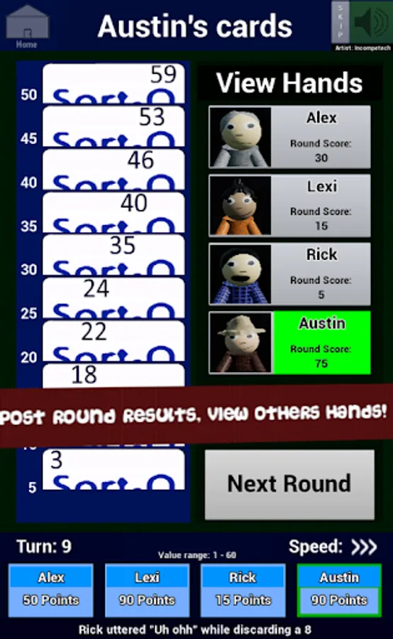 You can play anytime and anywhere against computers and/or friends! Sort-O allows for a 2, 3, or 4 player game, but only one human player is required. To allow for appropriate length games, in 2 player mode there are 40 total cards, in 3 player mode there are 50 total cards, and in 4 player mode there are 60 total cards. Play against your friends in pass-and-play mode, or play against computers at difficulties of your choosing. The bots range from Very Easy to Very Hard to allow for an enjoyable experience for everyone.
