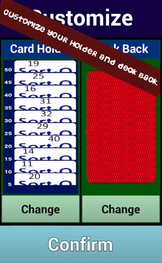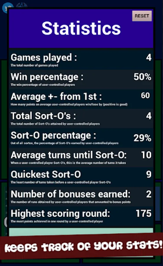 Sort-O keeps track of various statistics while you play. Take a look at your games played, win percentages, high scores, etc.. Use your statistics to figure out your weaknesses and improve your game. Strategically sort your cards and aim for a SortO!