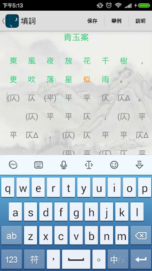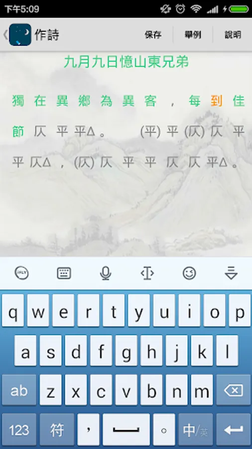 詩詞助手提供了常用的唐詩、宋詞、元曲等模版,包括五言/七言的絕句/律詩、以及廣為人知的六十多種詞譜和七十多種曲譜。模版給出了字數,平仄以及韻腳,方便妳用手機開始詩詞創作。