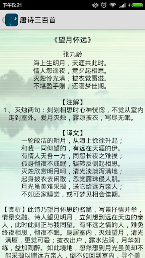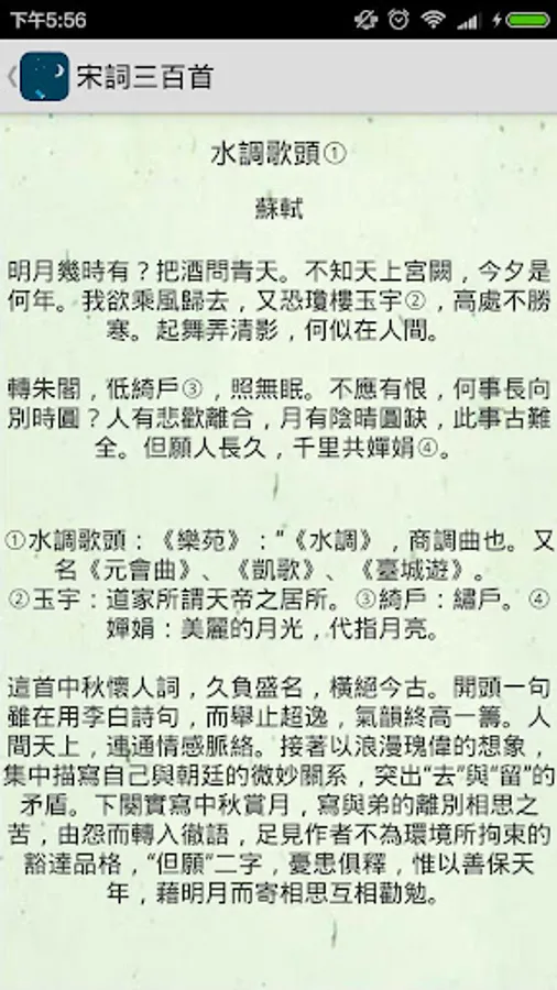 詩詞助手提供了唐詩三百首,宋詞三百首的正文/註釋/翻譯/賞析,讓妳盡情欣賞中華文化的博大精深。更多詩詞集,包括詩經,楚辭,漢賦等,陸續添加中。