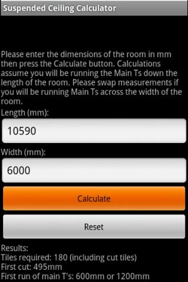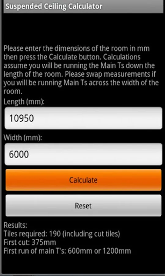 This app calculates the First Cut and Materials Required for suspended ceilings, also known as false or drop ceilings. Handy for ceiling fitters and estimators / quantity surveyors. All measurements and results are metric. Feedback and feature suggestions welcome. Please rate this app if you find it useful.
