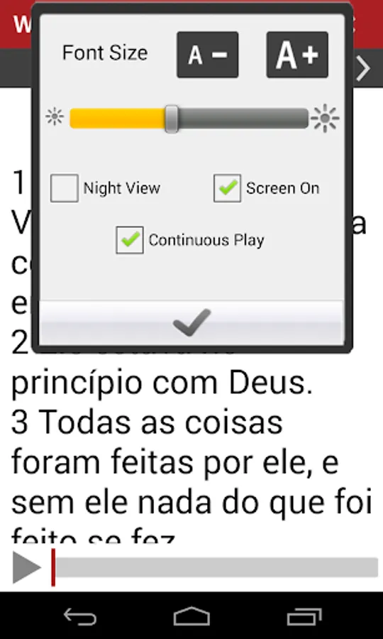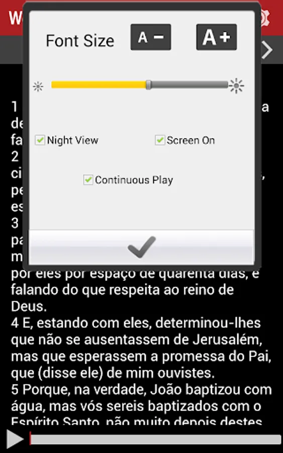 To use the audio continuous play option more effectively, please note that you should set the app to continuous play (on the settings page), and we recommend that you activate the 'Screen On' option. In many devices the screen needs to be always on for the audio continuous play to be in effect. In that case, we also recommend that you use the brightness level available on the same page, to adjust the brightness to a minimum. That way you can enjoy listen to the Bible for several hours and keep your battery. Of course if you plug your mobile device to the power outlet you can listen to the Bible all day…