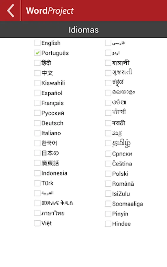 The application offers the Holy Bible (Text and Audio) in no less than 36 of the most wide-spoken languages of the world: Chinese, Hindi, English, Arabic, Portuguese, Spanish, French, Indonesian, Russian, Japanese, Korean, Italian, German, Swahili, Turkish, Vietnamese, Amharic, Thai, Persian, Urdu, Bengali, Gujarati, Kannada, Malayalam, Oriya, Punjabi, Marathi, Telugu, Tamil, Serbian, Czech, Polish, Romanian, Somali, etc. This application offers audio narrations, non dramatized versions. Portuguese narration in European Portuguese.