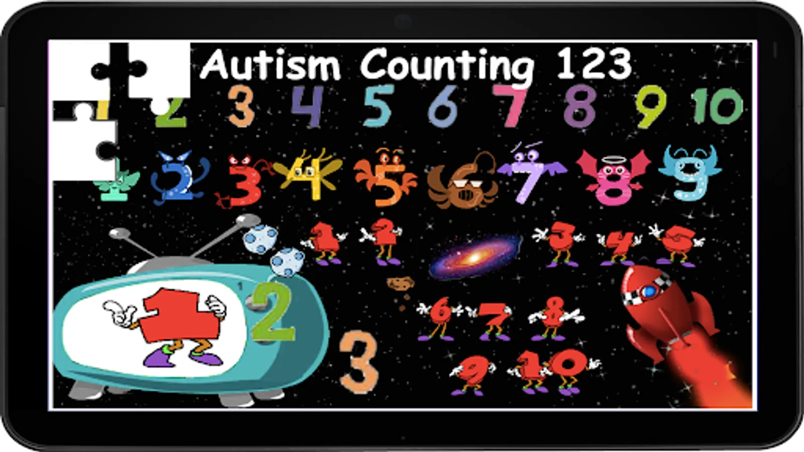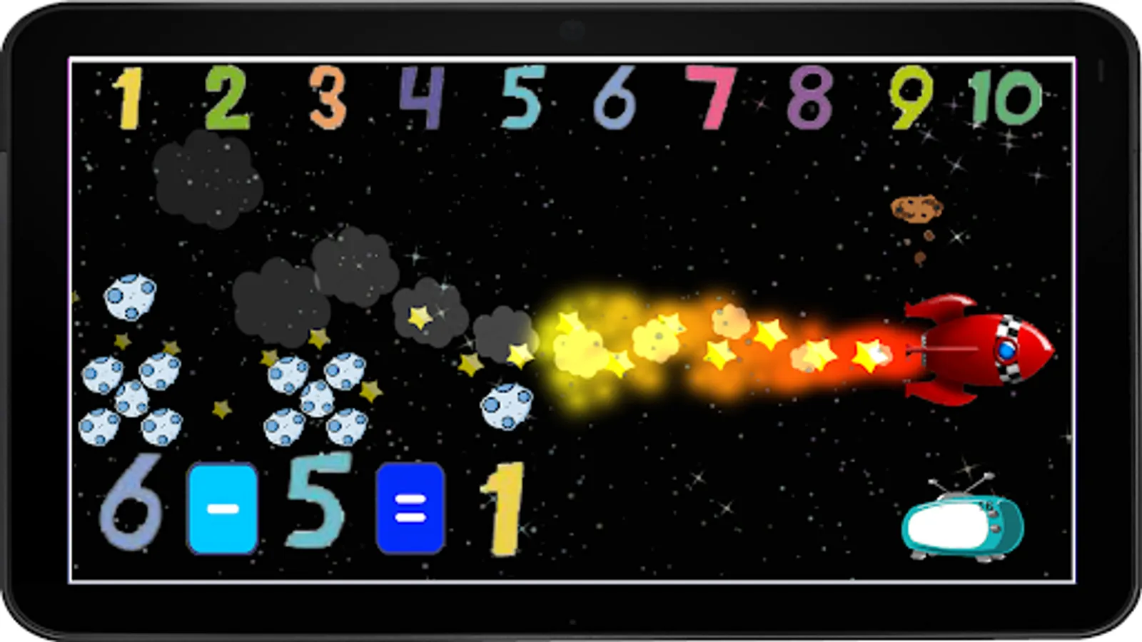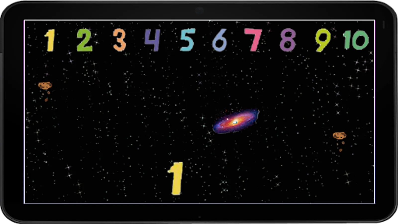 The number questions include associated quantities of satellites in sequential and random order as the game progresses. As the child learns the numbers the associated satellites disappear and the become more varied. The goal is to teach the child that each number is associated with a quantity of objects, rather than simply memorizing the number.