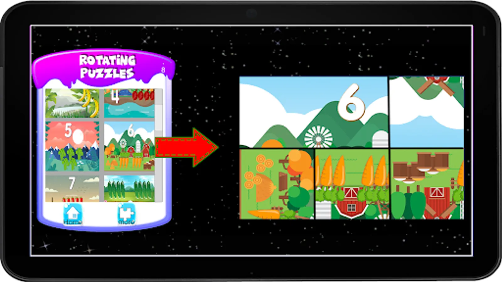 After the jigsaw puzzle a rotating puzzle of varying size and complexity (2x2, 2x3 and 4x6) with cool animations is presented.