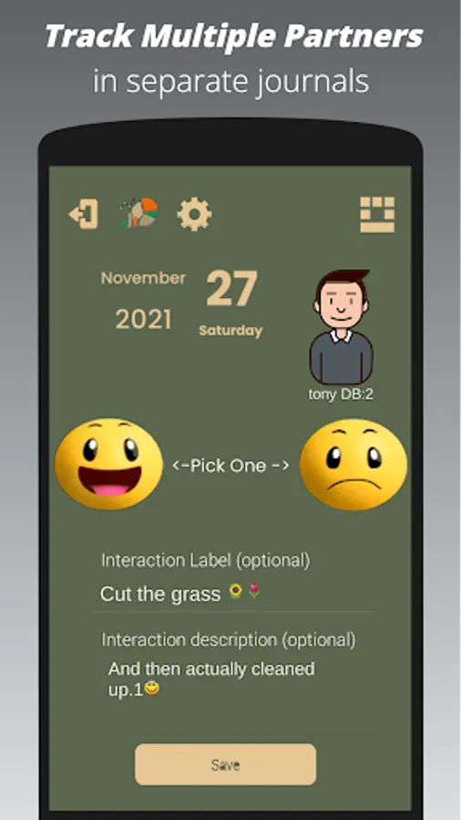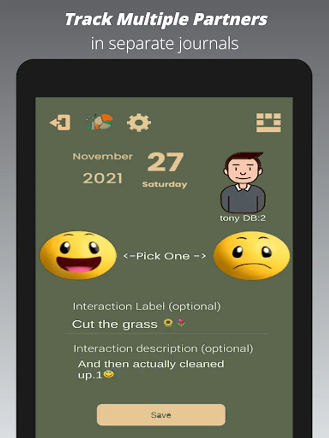 Love the quick journal system. Two clicks and I saved a good or bad experience. Or I add emojis and notes if I want more details. Wasn't sure I needed this but after using it for a while I can get snapshots (they call them scorecards) of the ups & downs in my relationship. Fun but scary to see how things are going sometimes. I did buy the dollar upgrade for the extra snapshots but don't use the polygamy or security stuff.