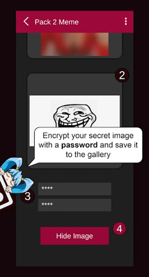 Pack 2 Meme is a steganography tool intended to encrypt and hide an Image (target) within other images (carrier) and then save it to the gallery.