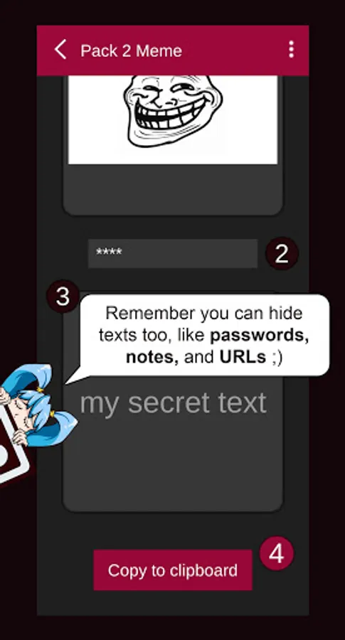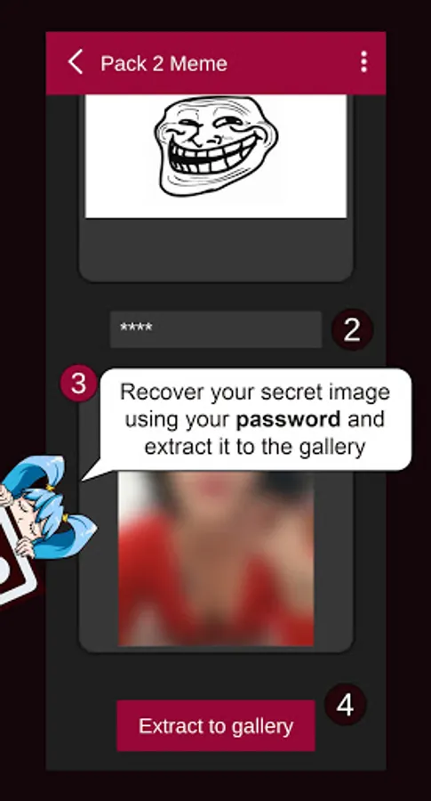 Carrier Images can only be decoded using Pack 2 Meme app.
