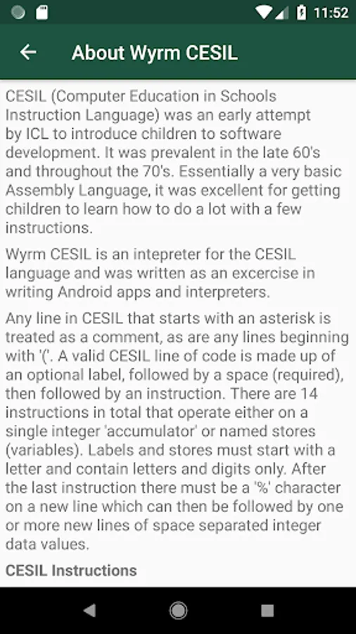 Wyrm CESIL is an intepreter for the CESIL language and was written as an excercise in writing Android apps and interpreters.