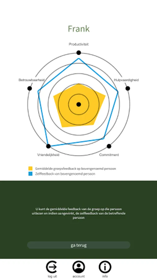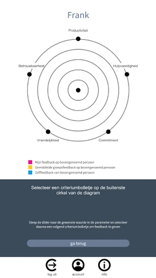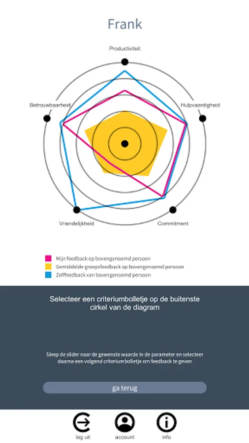 This tool has been developed to support collaborative learning: the feedback and reflection tool called FROCOLE; FROCOLE stands for Feedback and Reflection in Online Collaborative Learning. Using the FROCOLE app you can give yourself and your group members feedback on a number of criteria (max 9 indicators) related to collaborative learning and group dynamics. The feedback can then serve as input for reflection. To quickly gain insight into the feedback, these have been made visual by means of radar diagrams that look like a kind of spider web.
