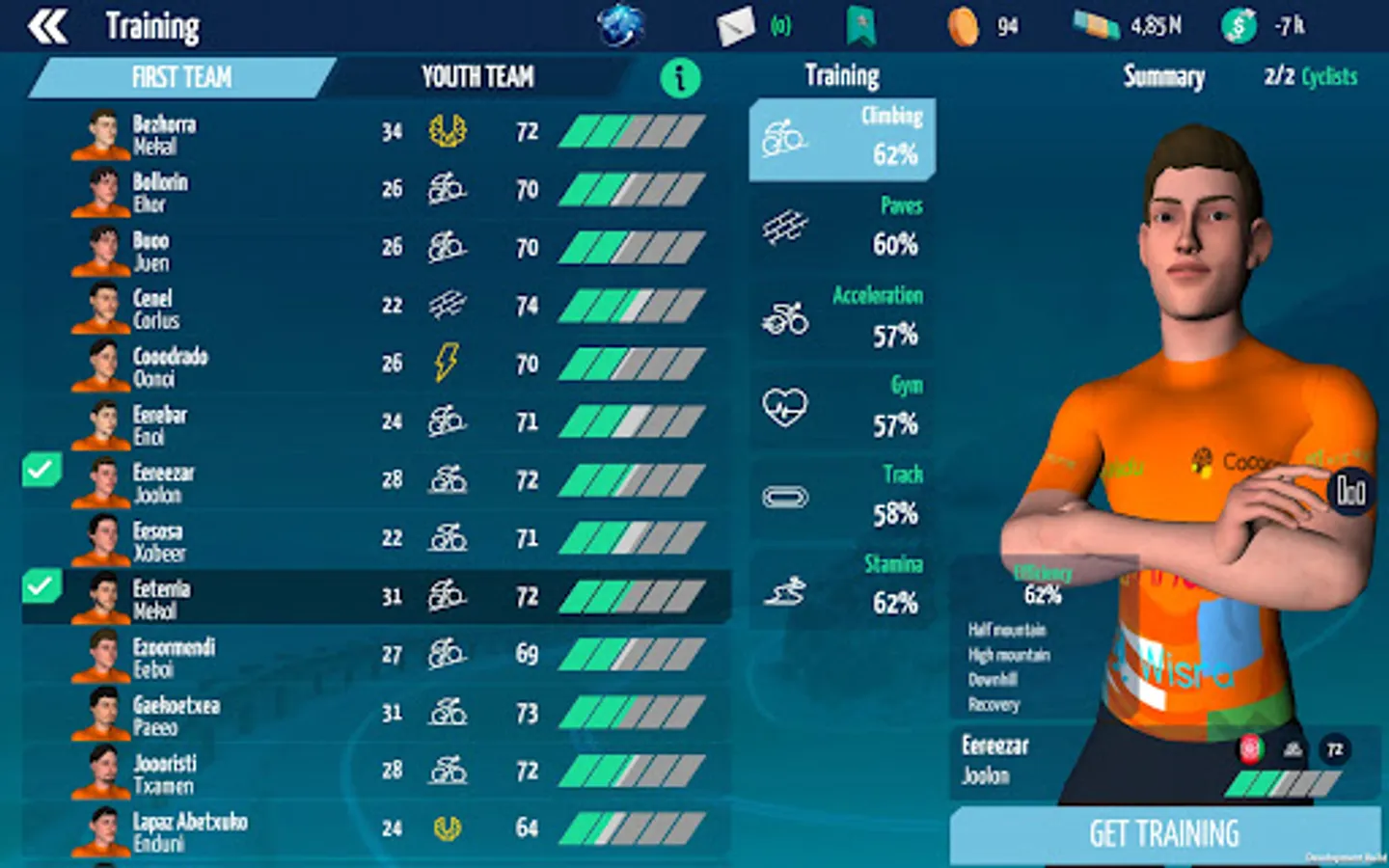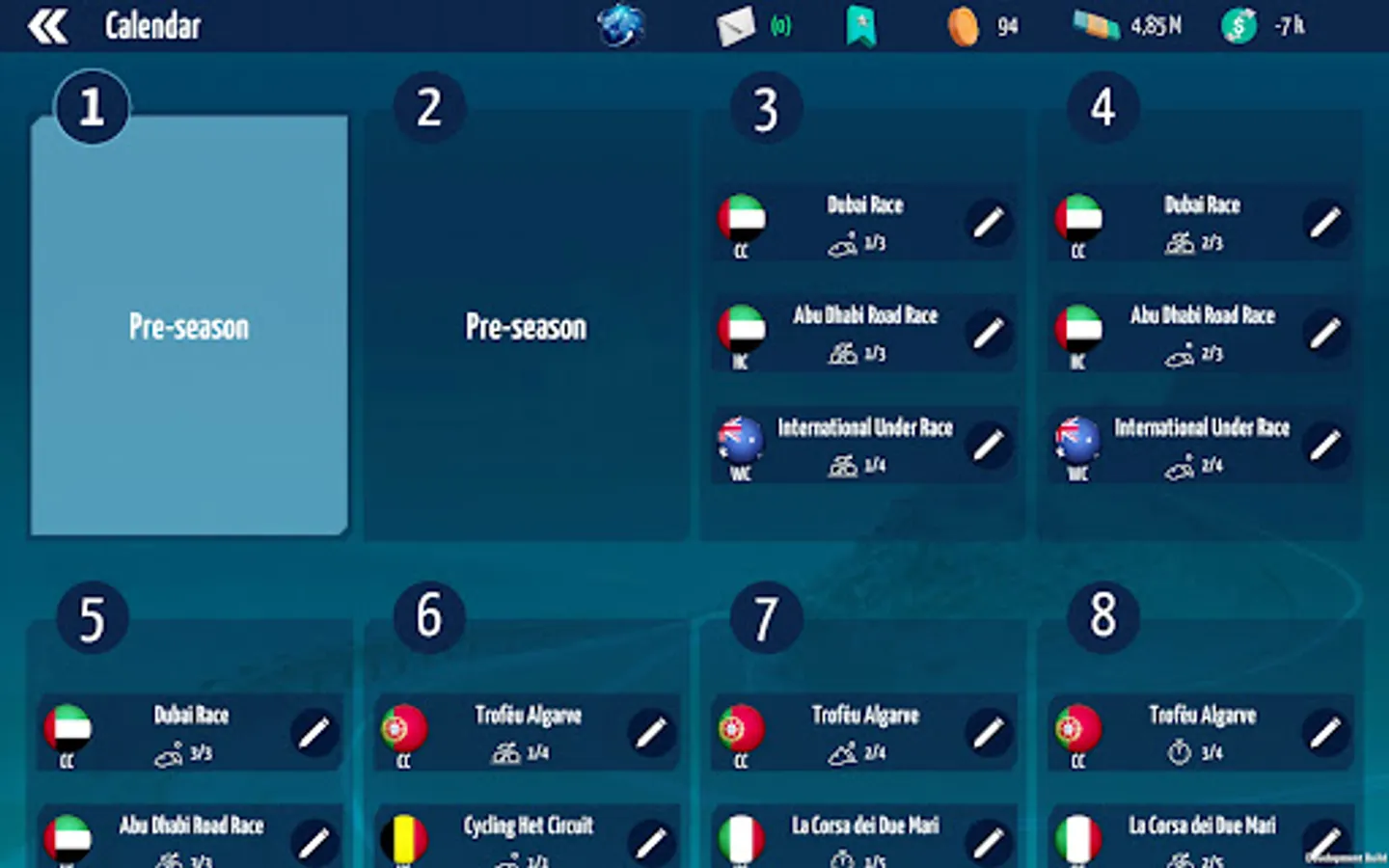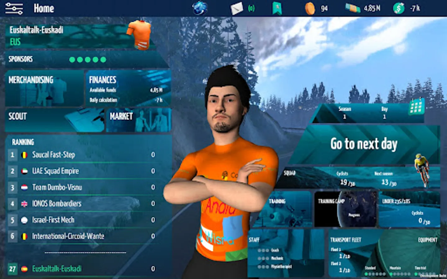 Control all aspects of your club: from training sessions, transfers, staff, registration in races, racer selection and race strategies, to finances and designing your kit.