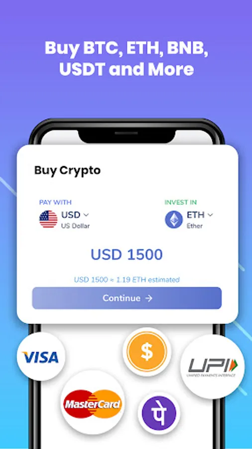 - Buy crypto with Debit/Credit cards & Bank account.