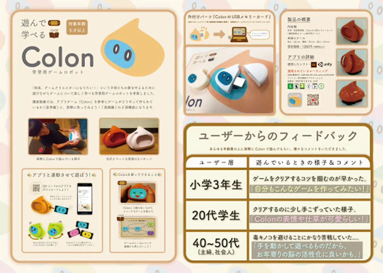 ・ Many of the conventional games are operated by pressing the cross key and several buttons, but in Colon, by incorporating emotional robot elements and making it a system that can be played by tilting, you can feel the fun of playing by moving your hands. I succeeded in increasing the chances of interacting with Colon.