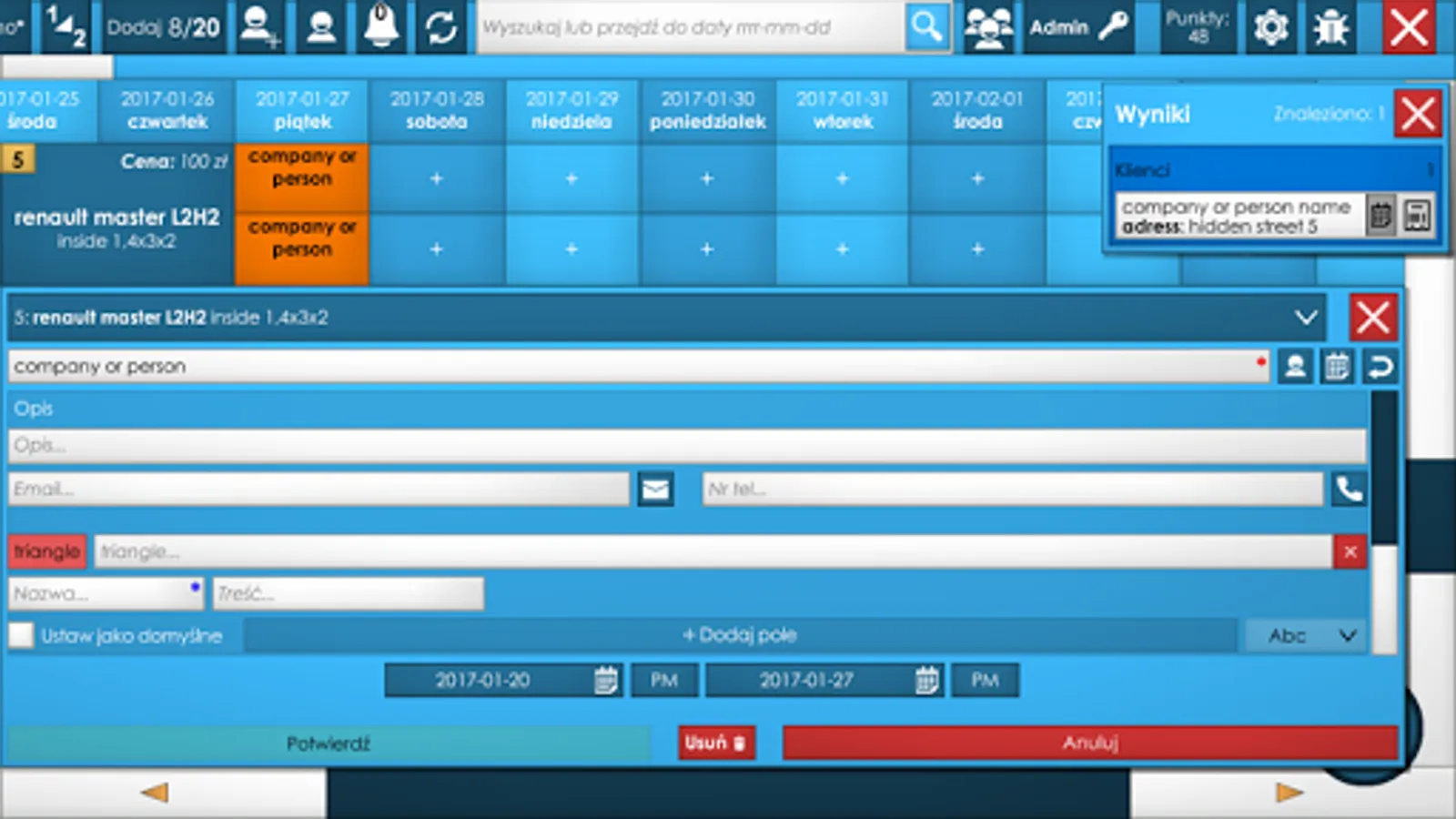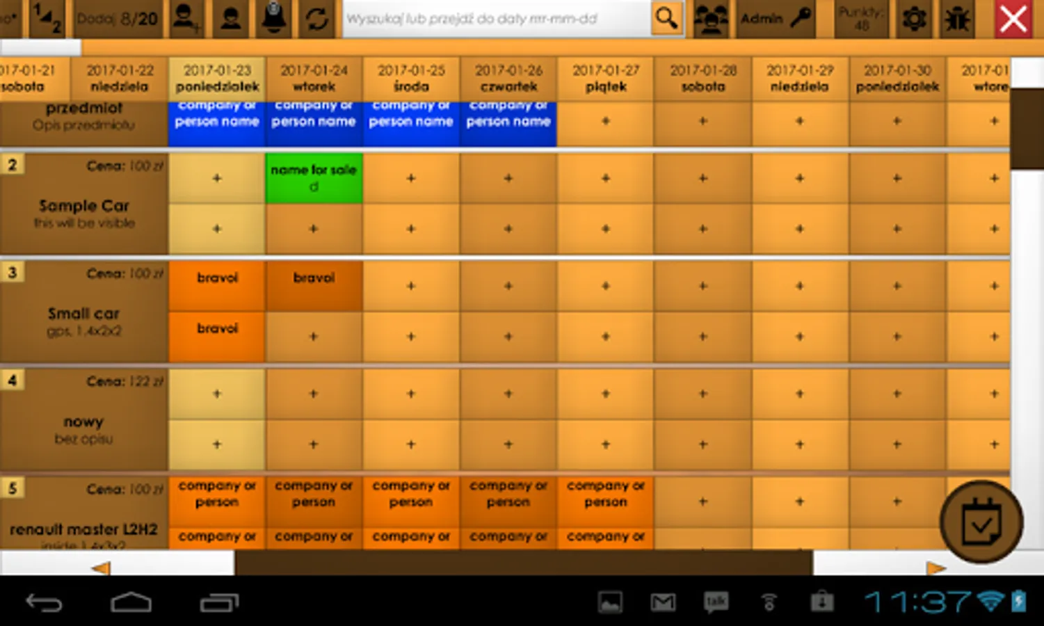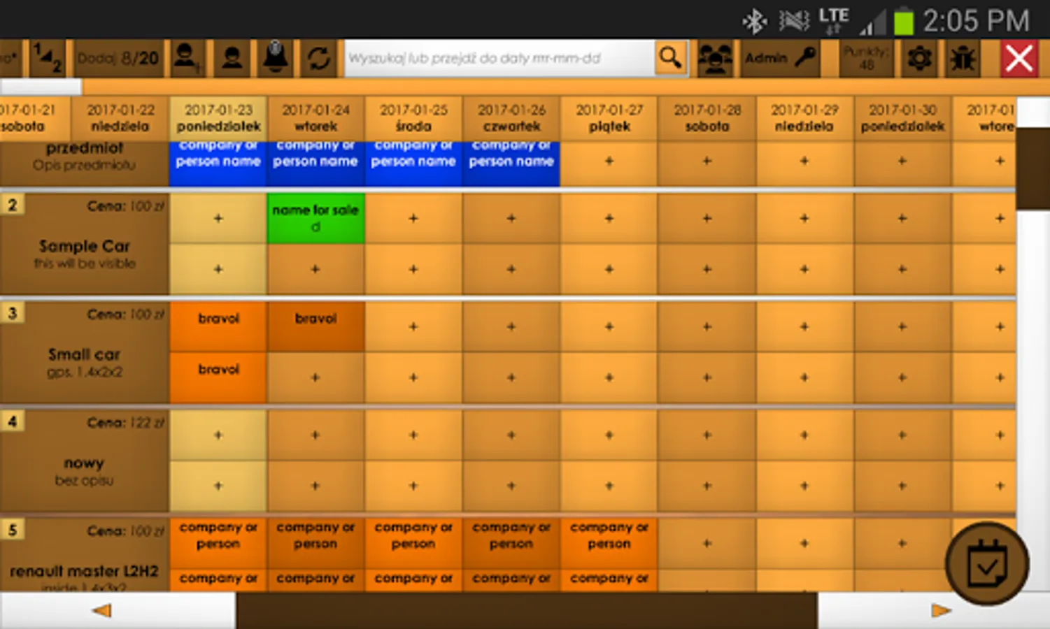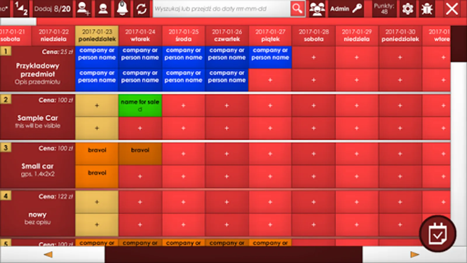 Easy to use in car rentals or small hotels while making your work easier and reduce chance to rent same item twice at same time. Unlimited number of items with clear descriptions allows to quickly create reservation on correct room/car even for new employees.