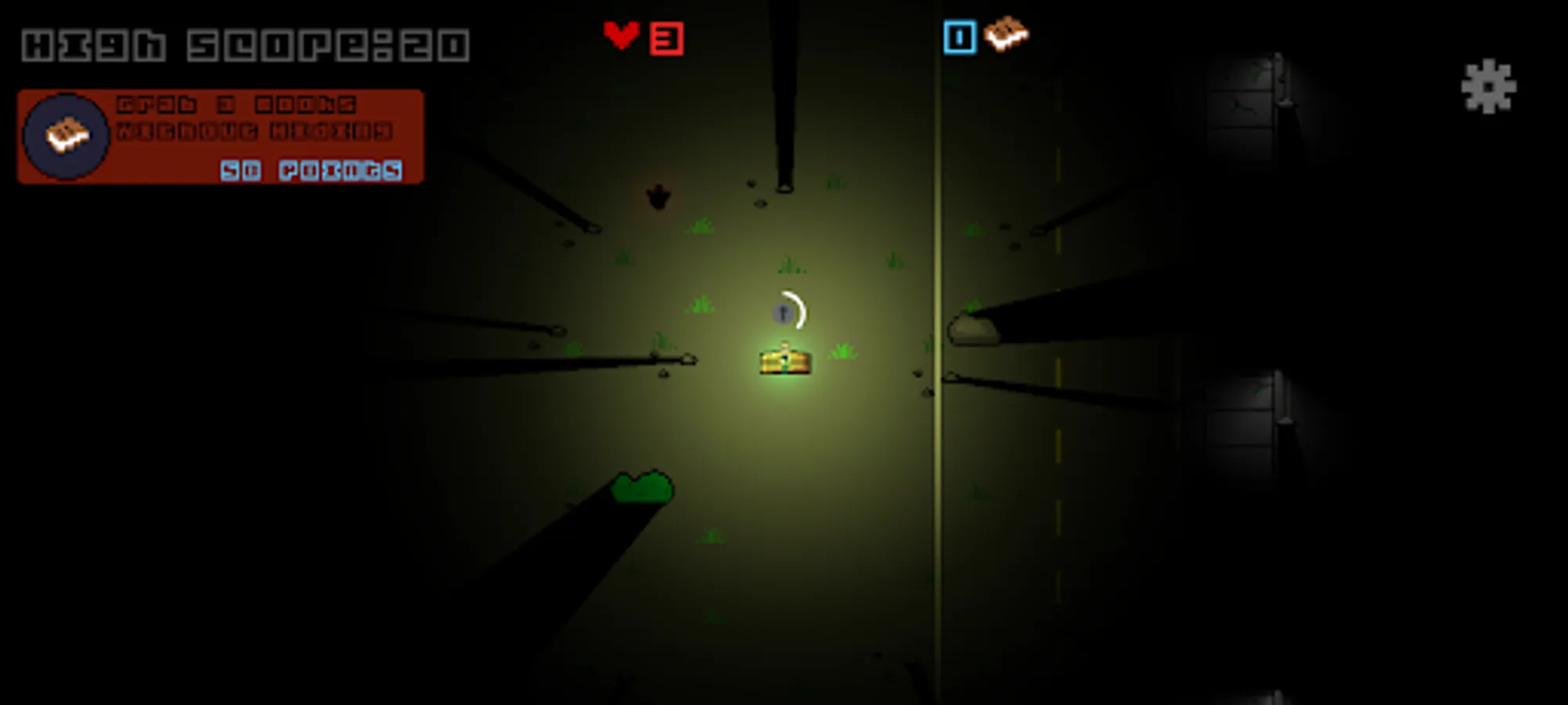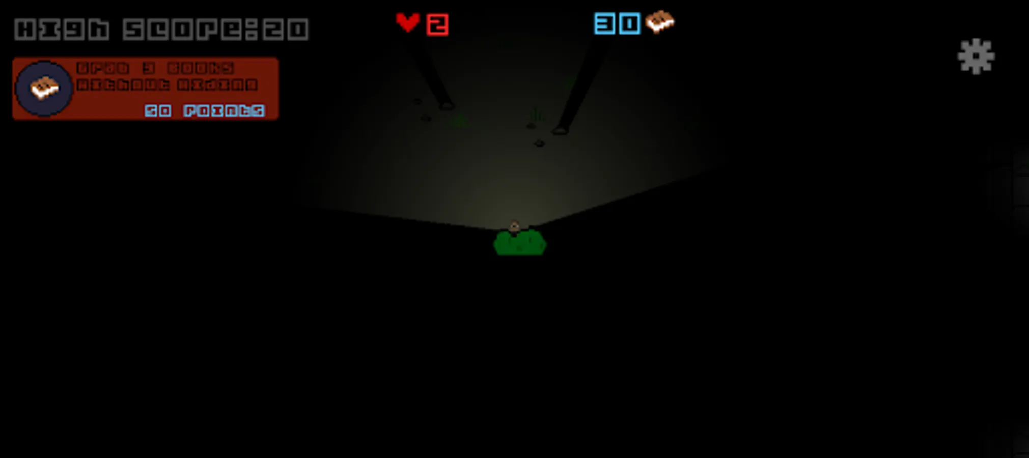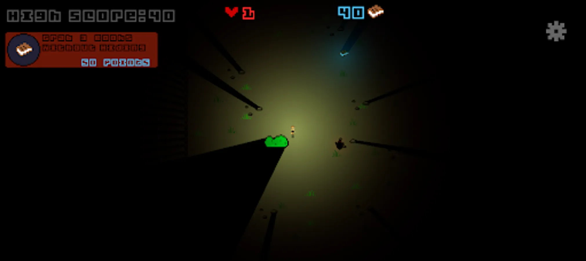 You are a librarian who has lost his books and now you have to pick them back up. Run from the monster chasing you in the dark and avoid it by hiding in bushes and behind rocks.