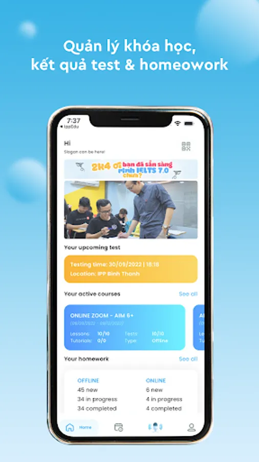 IPPEDu App là ứng dụng giúp HV quản trị toàn bộ quá trình học, luyện tập 24/7 cùng trợ lý ảo, và cập nhật các kiến thức mới về bài thi IELTS. HV sử dụng IPPEdu App để: