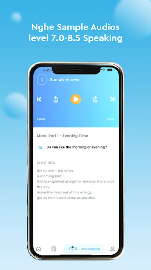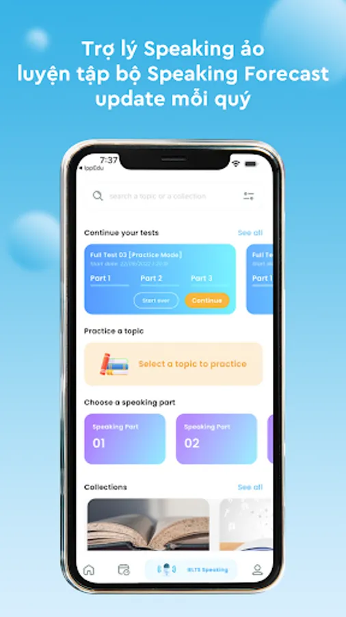 - Trợ lý Speaking ảo giúp HV tự luyện Speaking ở nhà qua phòng thi Speaking ảo, hướng dẫn trả lời, và sample audios được thu ở level 7.0-8.5 Speaking cho bộ IELTS Speaking Forecast được cập nhật mỗi quý