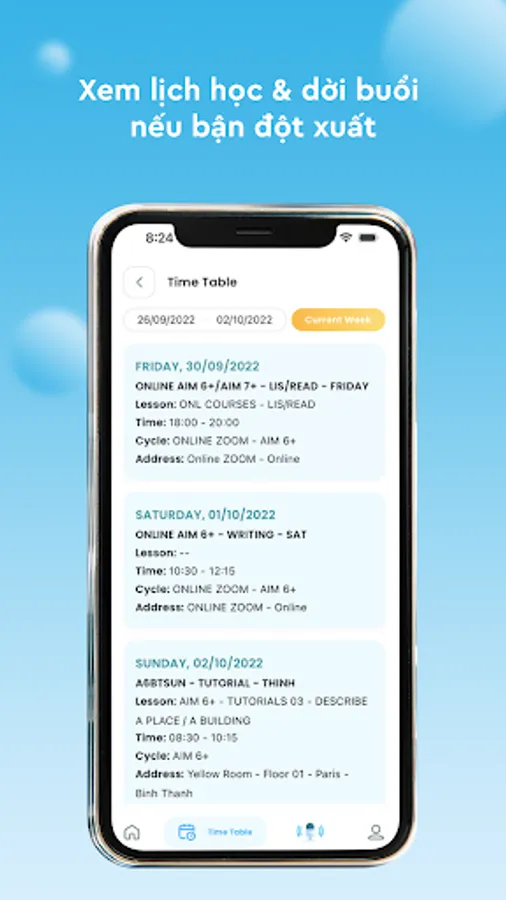 - Kiểm tra lịch học, dời buổi học nếu bận (đảm bảo không mất buổi, không mất bài)