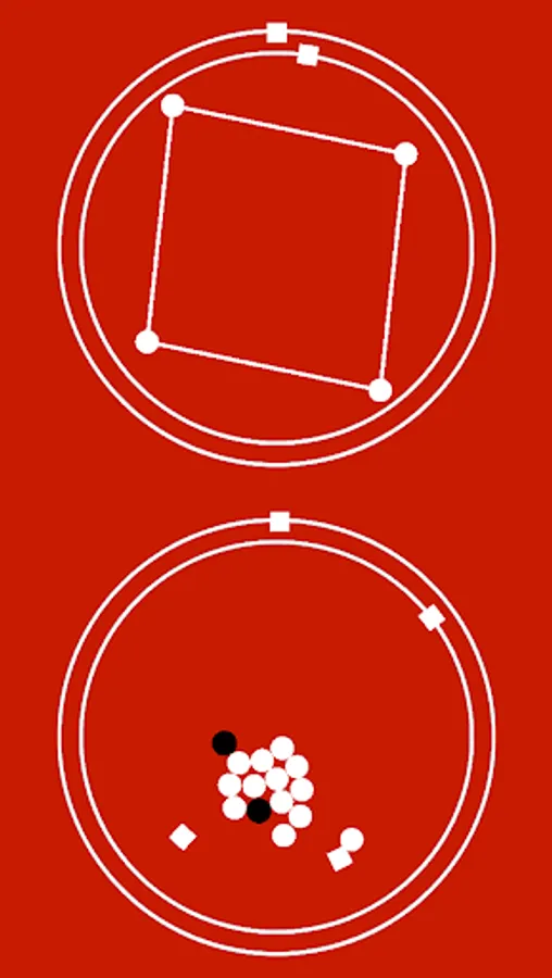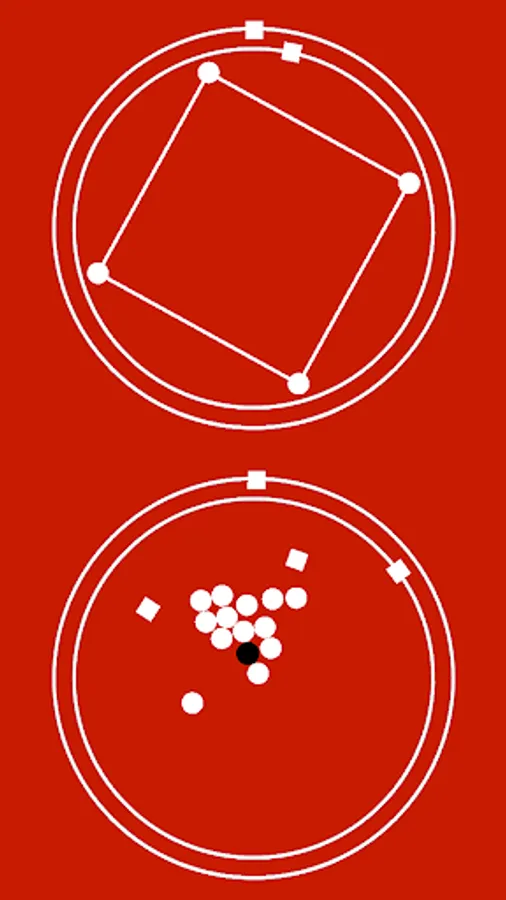 Within Stage 2 "Cooperation", spheres appear following shocks to the microphone and are recognized as movement of water, which were recorded using a hydrophone along the banks of St. Lawrence River. These sound spheres have gravity, interacting with each other, colliding when they come in contact with each other, which will generate shorter sound pulses.