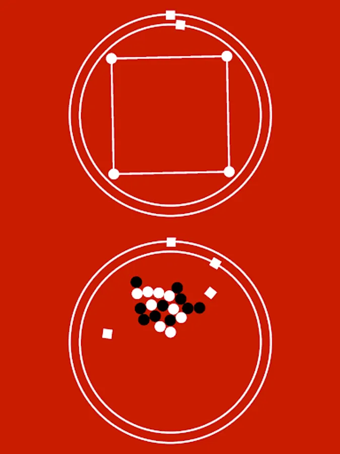 White and black spheres will be generated. The white spheres generate sounds when contacting other white spheres. The same thing for the black spheres. Contacts between white and black spheres generate longer sounds, referring to various Montreals soundscapes: the Port Symphonies, La Ronde, the Silophone (The User), the Formula 1 Grand Prix, and so on. Rotating squares serve to attract the spheres, according to their swinging motion.