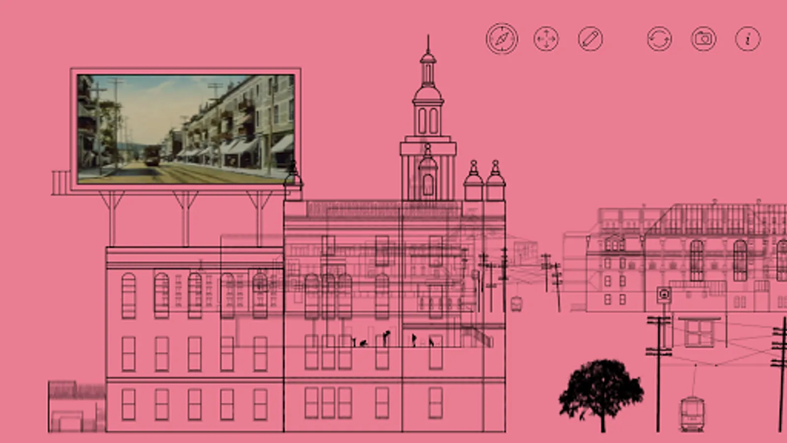 The project builds on an architectural representation of elevation cutting system. The application hosts over a hundred images, each representing elements of architecture, history or anecdotes of users related to space. These were collected in a participatory design workshop. The thread of the application is the time line. Indeed, from the past with the current library, at present with the development project instead Gérald Godin, until future with the projected library.