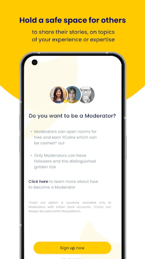 This is a conversations only platform and does not provide any counseling, advice or solutions. This is a platform for adults, who can take responsibility for their behaviour and engage in authentic yet respectful conversations in an audio / visual format. We have zero tolerence for bad behaviour (harassing, bullying, nudity, abuse etc.) and repeat offenders could be permanently debarred from the platform.