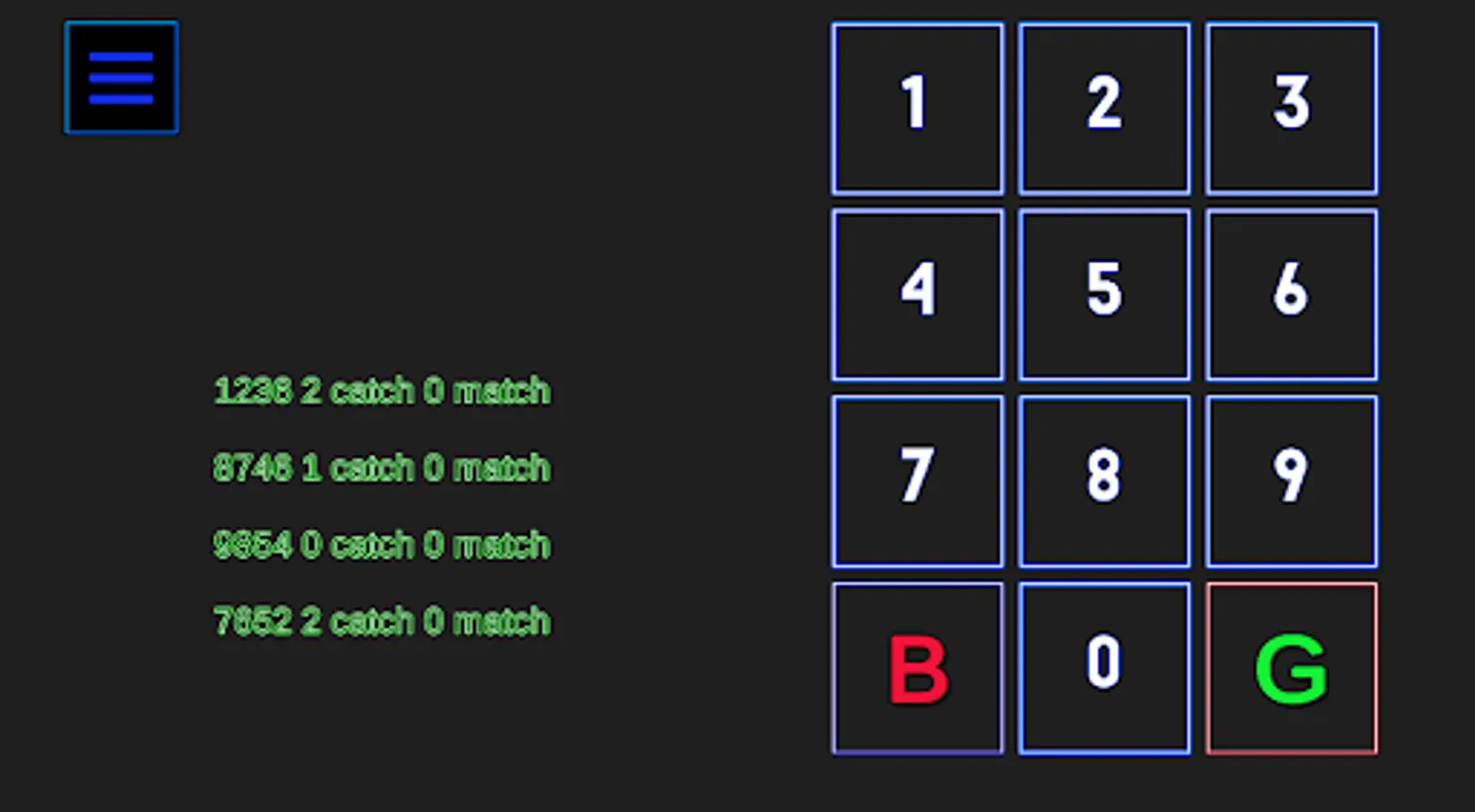 This game randomly generates a four-digit number for you to guess. for each Guess, you will get a clue how many digits are caught and how many digits are matched. The ultimate goal is to get four matches to complete the game. Try to guess the number in as many fewer steps as possible. Enjoy!!!!