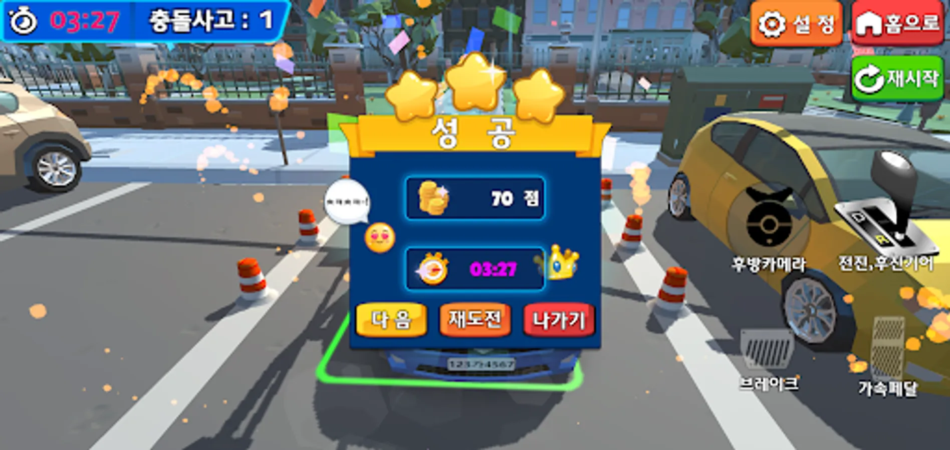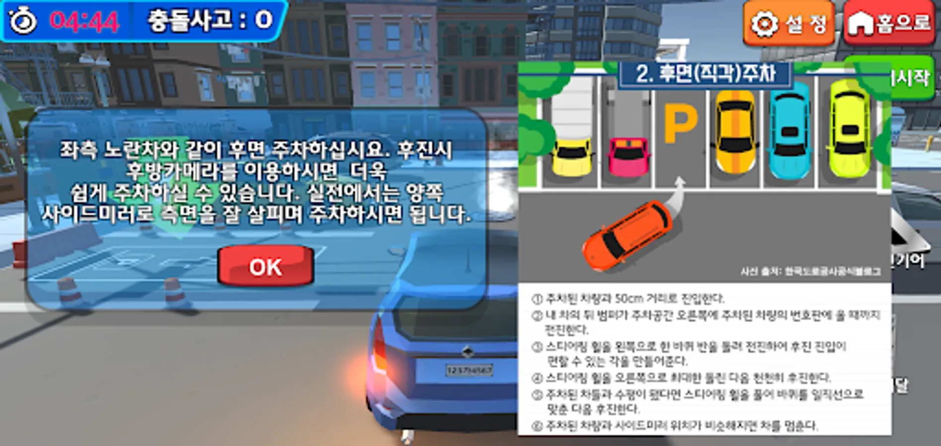 Through this app, you can practice forward parking, reverse parking, and parallel parking, and you can run freely on the road without having to practice parking.